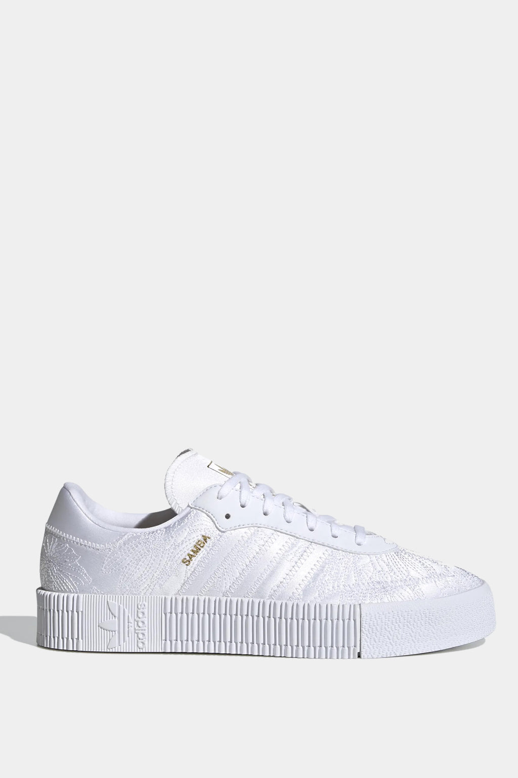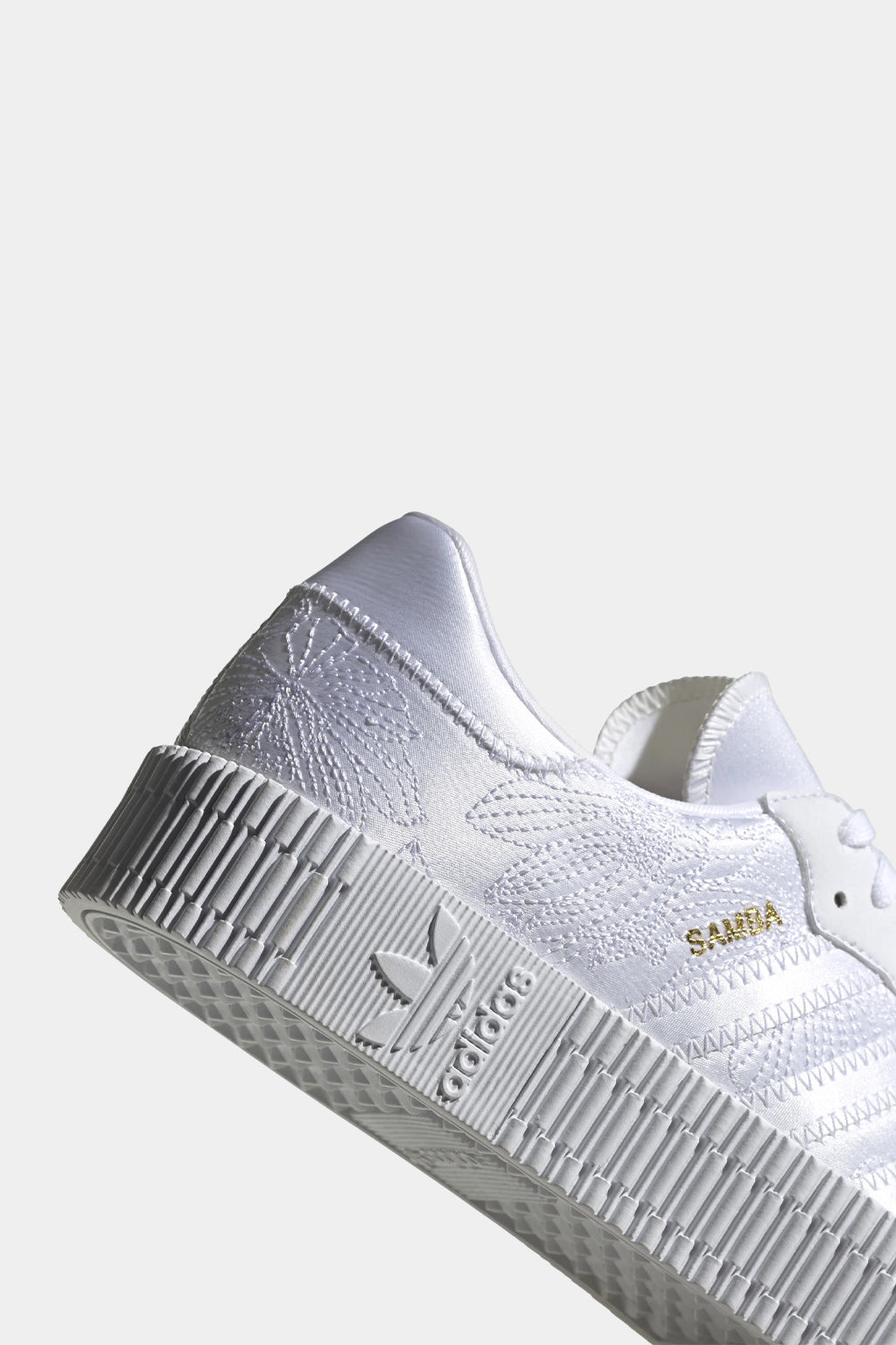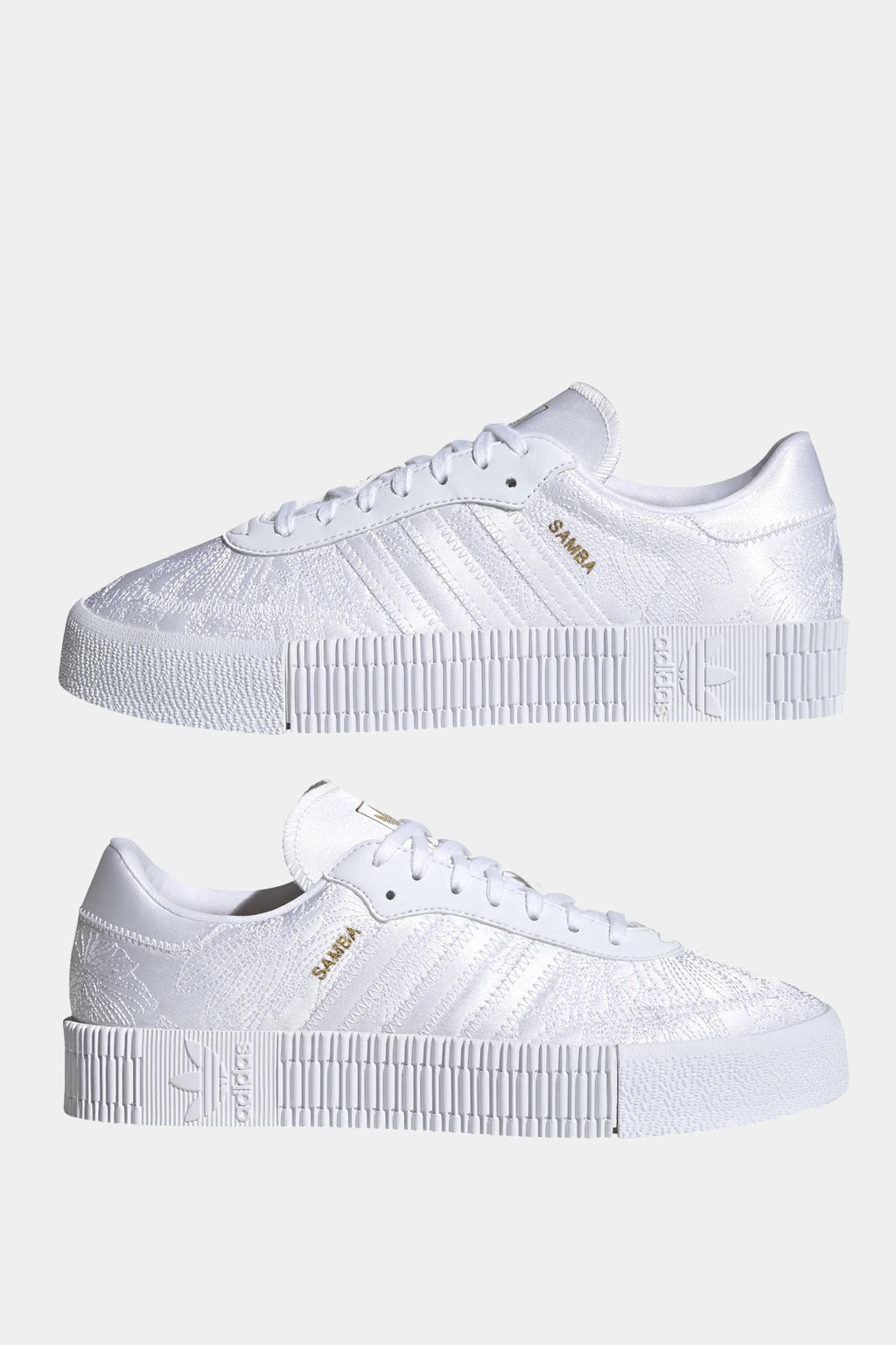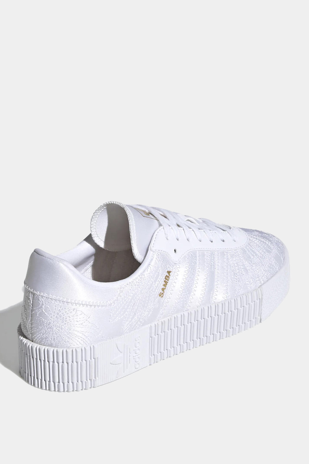 Step up to an elevated take on an adidas classic. Sambarose shoes put a feminine spin on a perennial favourite (hello, samba!) with a trendy platform outsole. Fresh for the season, this version celebrates the first arrival of snowdrop flowers in spring, with delicate floral embroidery on white satin. Gold letters spell out "Samba" to honour the adidas heritage, and a gold sockliner adds a touch of glam.