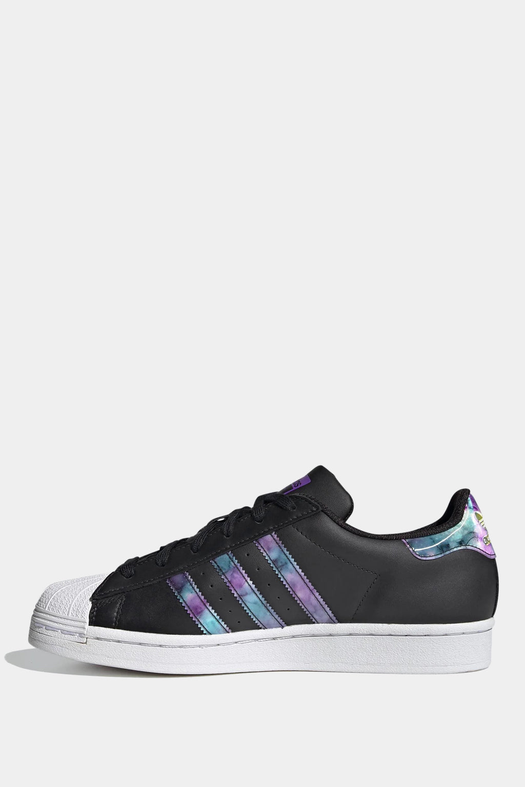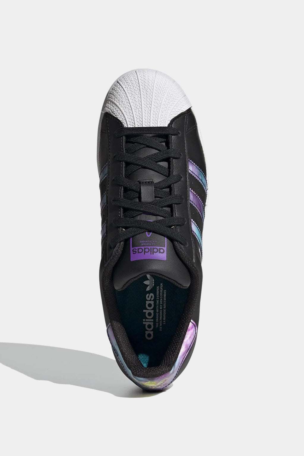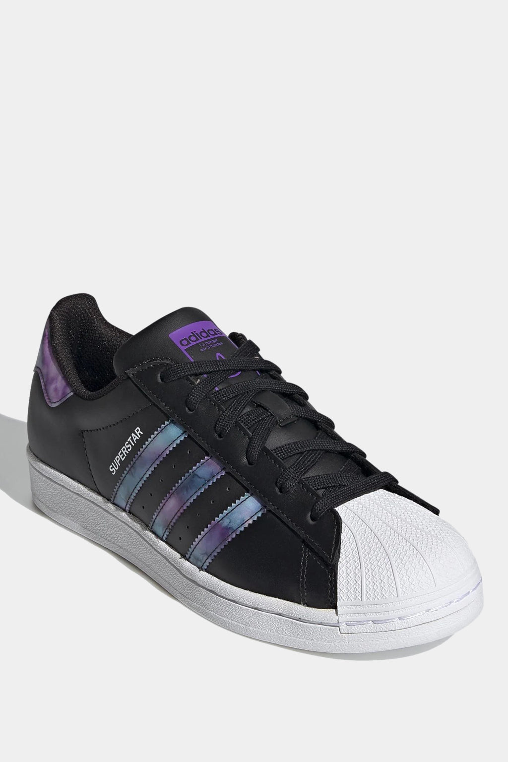 Show your attitude. The classic adidas Superstar shoe features lens detailing that changes from purple to teal depending on the angle of view. While keeping classic details: 3-Stripes, rubber shell toe, heel tab. Stylish, comfortable and designed to convey your attitude. Wear it and show your aura.