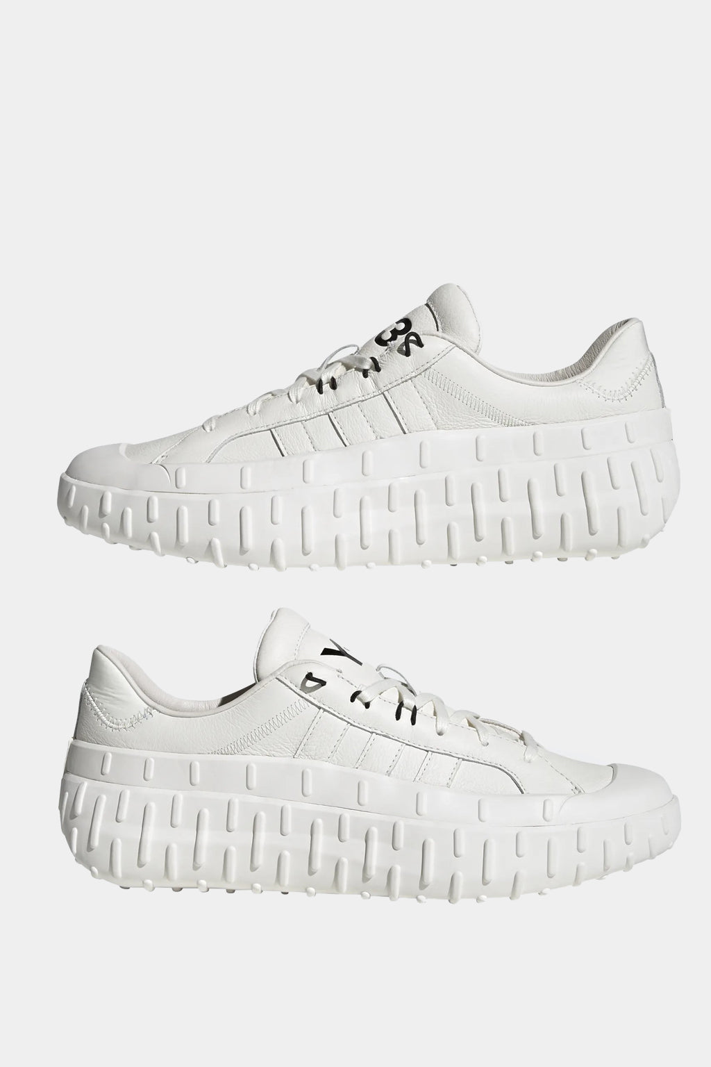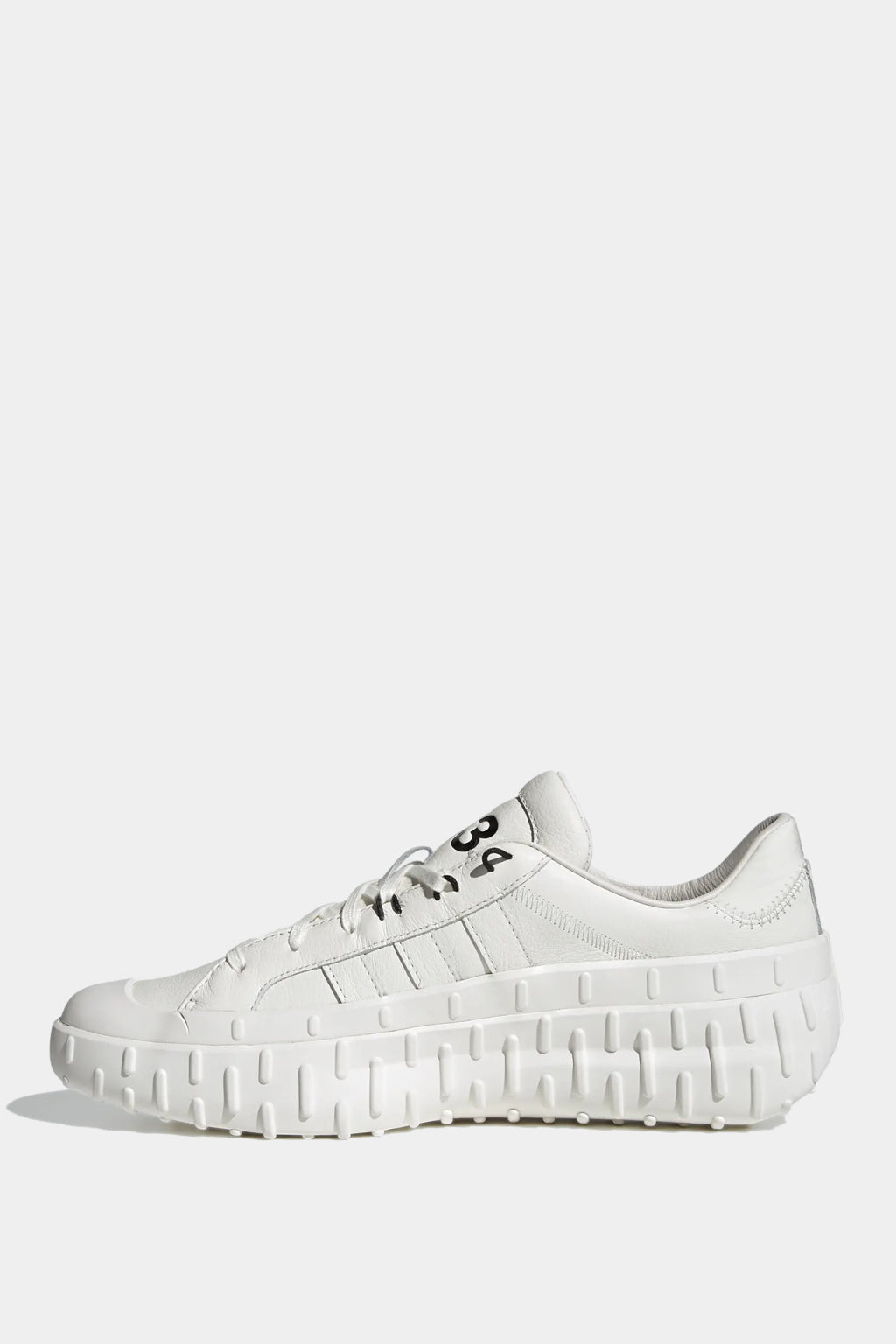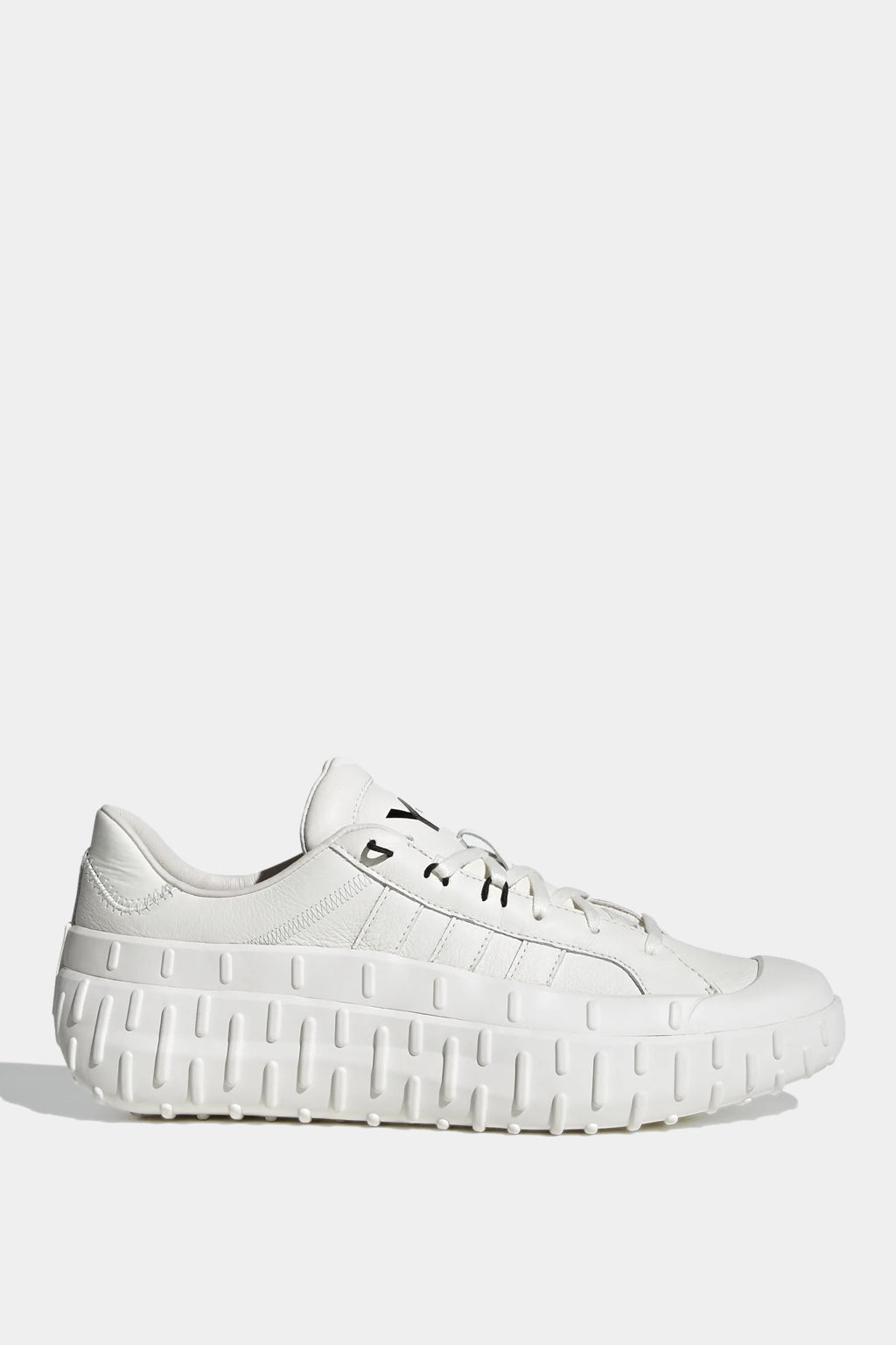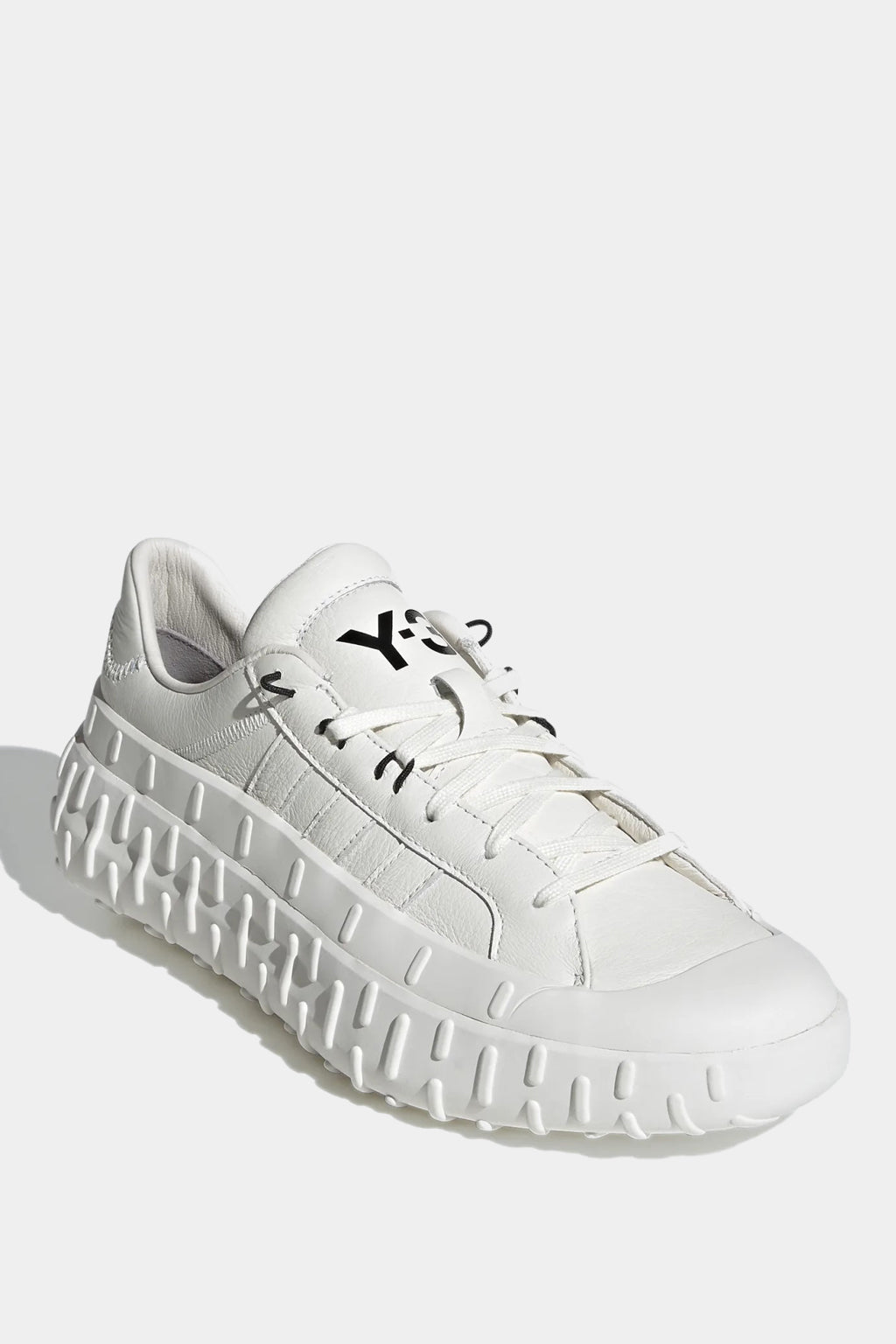 Y3 gr1p trainers in white. Taking their progressive approach and sartorial influence to the next level, the gr1p trainers represent the next evolutions of athletic footwear. Boasting a multi-layered, textured, eva midsole which extends into a mudguard across the uppers, a minimal white base gives way to contrast branding to the tongue.