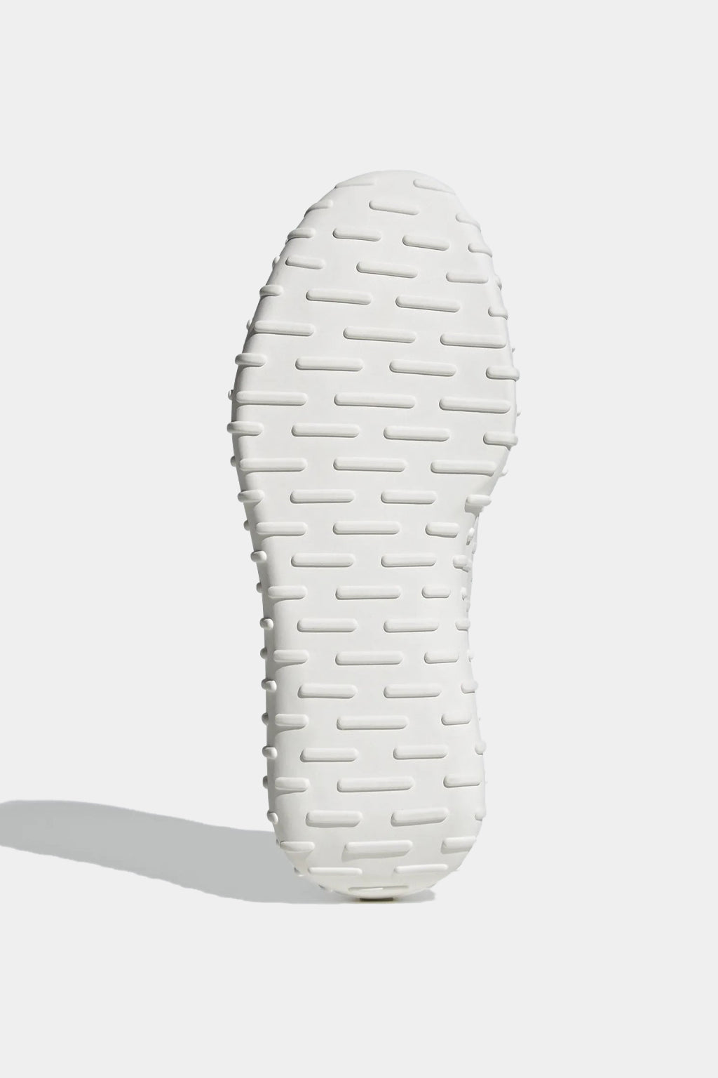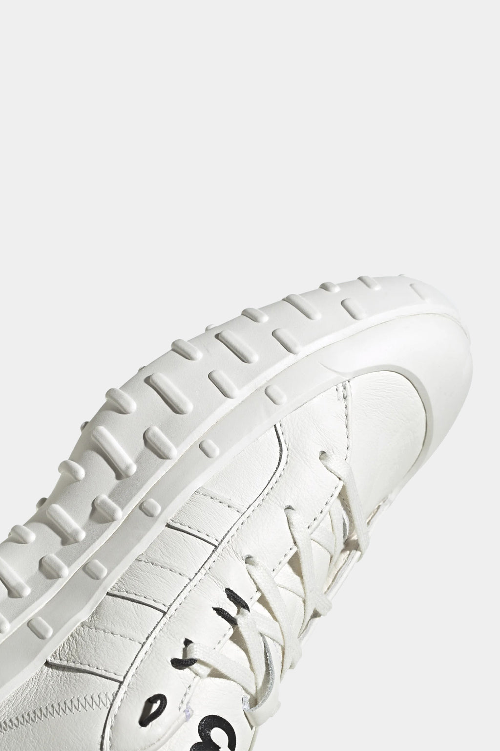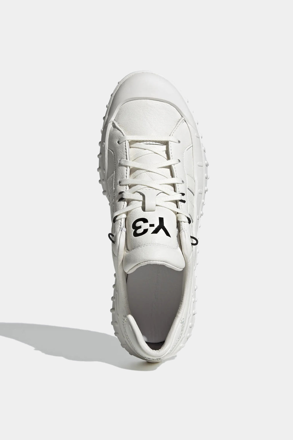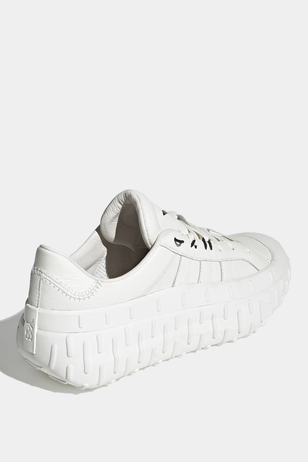 Y3 gr1p trainers in white. Taking their progressive approach and sartorial influence to the next level, the gr1p trainers represent the next evolutions of athletic footwear. Boasting a multi-layered, textured, eva midsole which extends into a mudguard across the uppers, a minimal white base gives way to contrast branding to the tongue.