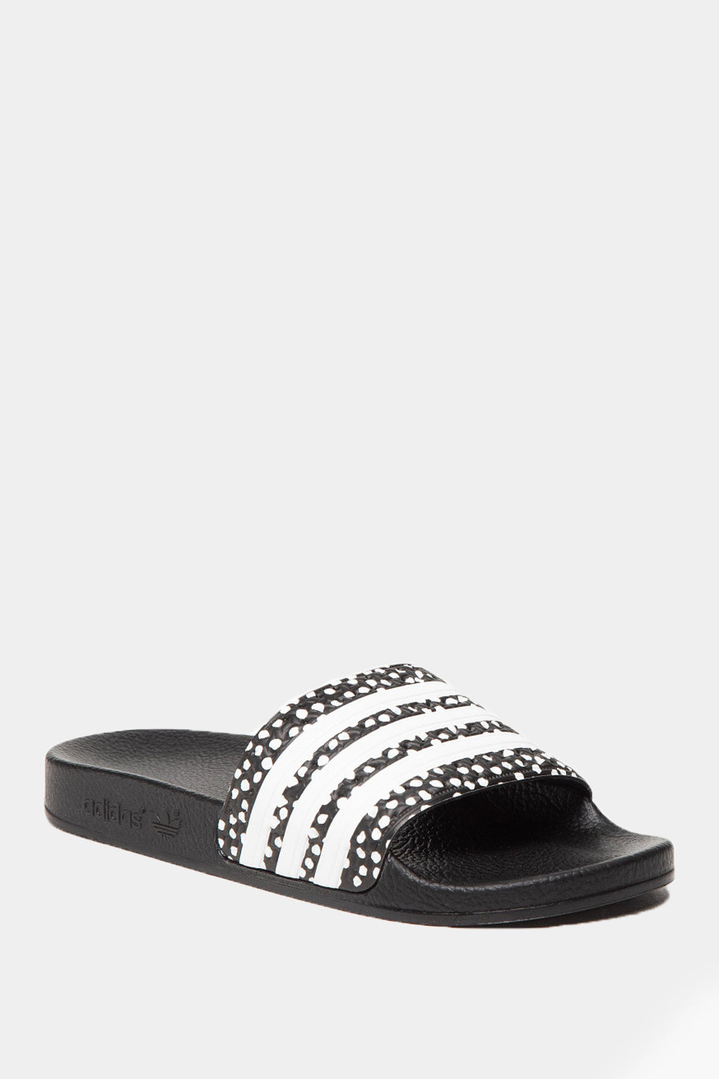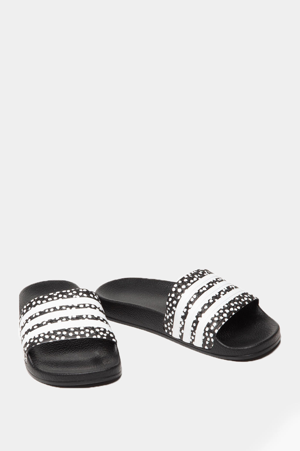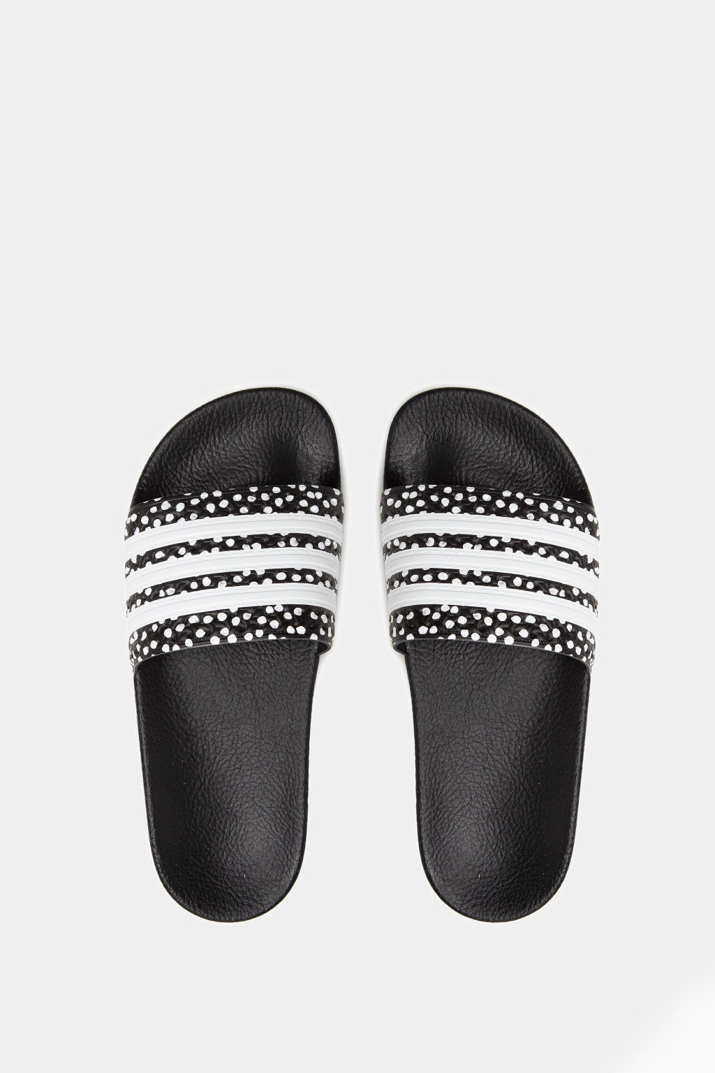 Slip on these Adidas slides over a pair of socks and take your favorite footwear outside. A polka-dot print on the soft bandage upper gives them a summery feel. classic slides featuring a polka-dot print.
