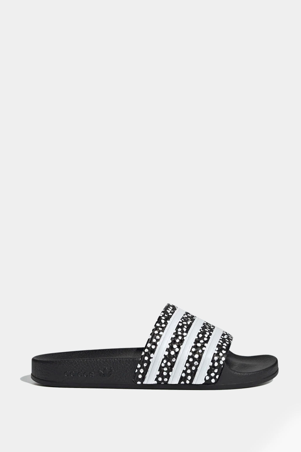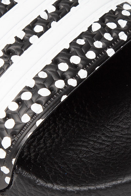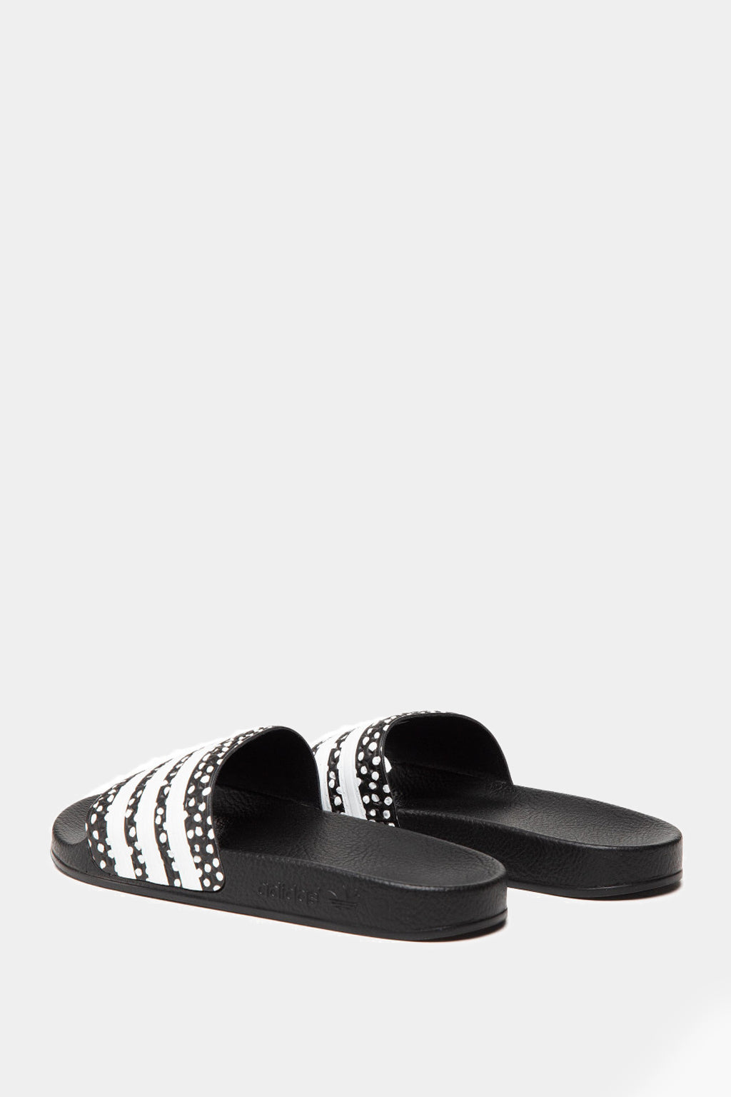 Slip on these Adidas slides over a pair of socks and take your favorite footwear outside. A polka-dot print on the soft bandage upper gives them a summery feel. classic slides featuring a polka-dot print.
