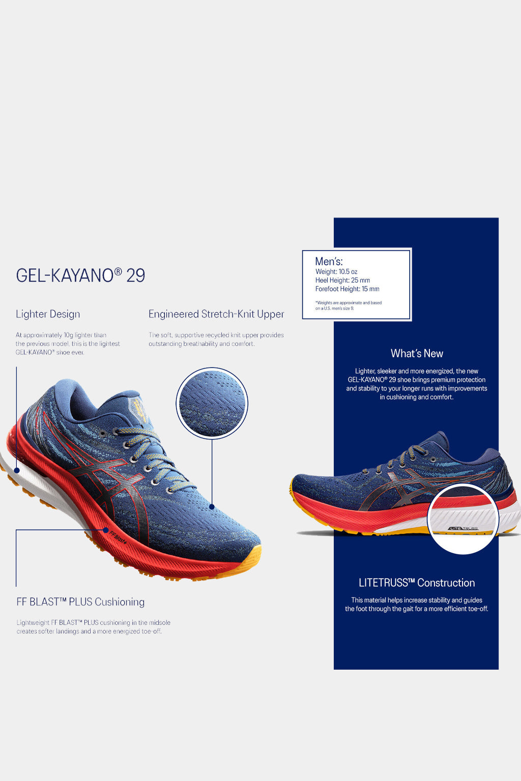 The Asics Gel Kayano 29 running shoes offer a steady and reactive run thanks to a low-profile heel counter that supports the rearfoot. The midsole has been upgraded with FF BLAST™ PLUS cushioning for a lightweight yet energized step, and the LITETRUSS™ stability feature on the inside angle of the midsole prevents excessive inward rolling during your stride.