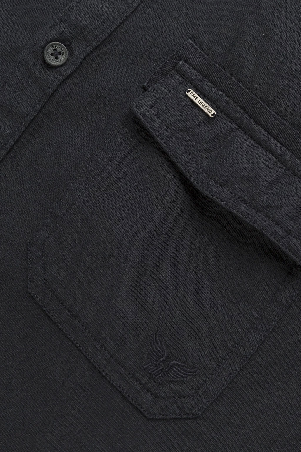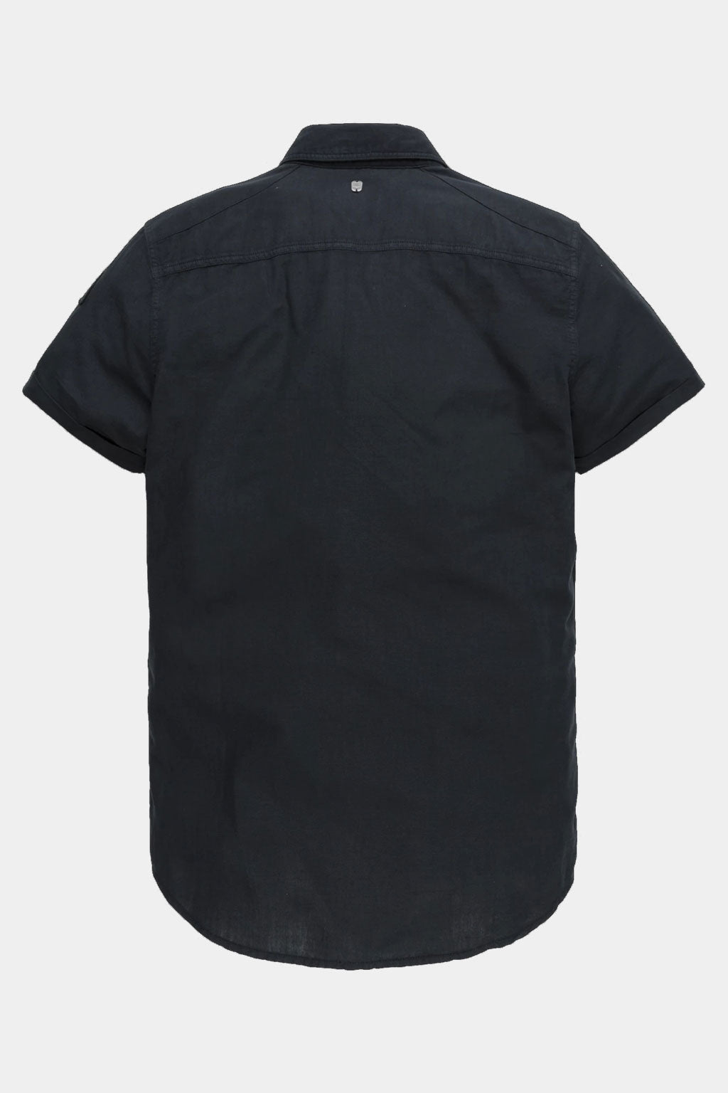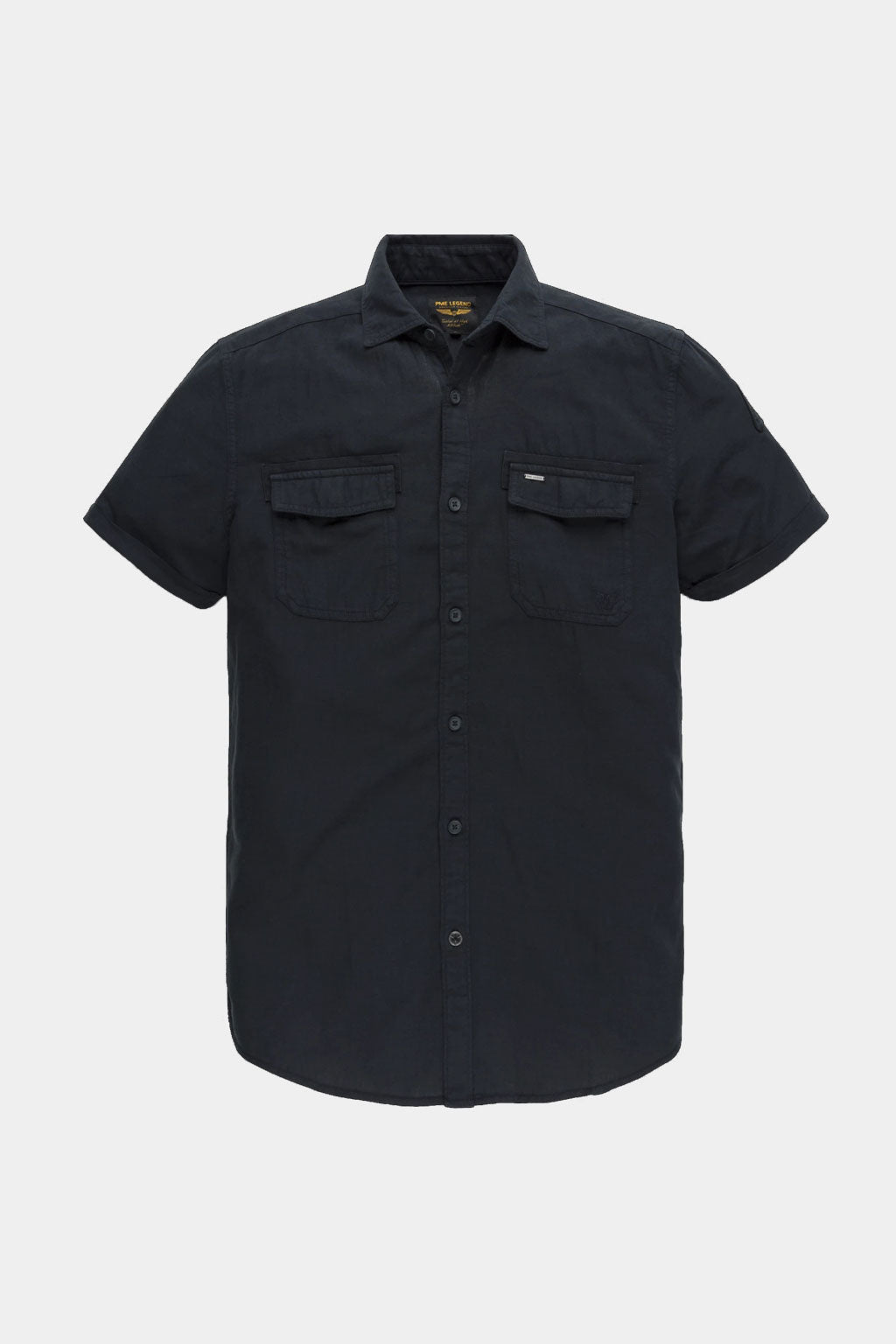 Cotton linen short sleeve shirt with two chest pockets, a PME legend badge in the same color on the left sleeve, a subtle metal PME legend plaque on the back and reinforced cargo patches on the shoulders.