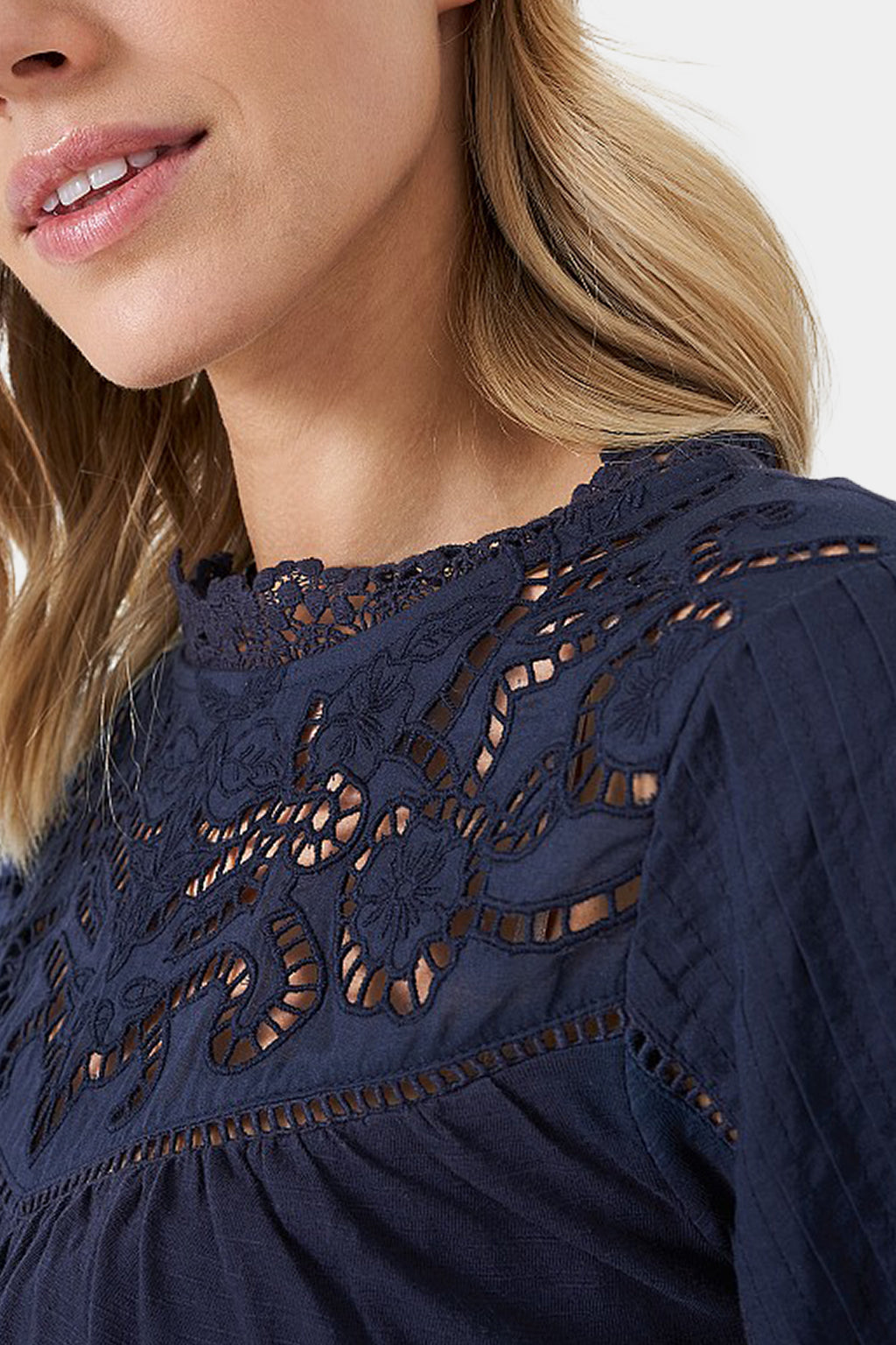 Discover our navy Gabor top, featuring delicate lace details and feminine frills for a touch of elegance. This top effortlessly elevates any outfit, especially when paired with denim.