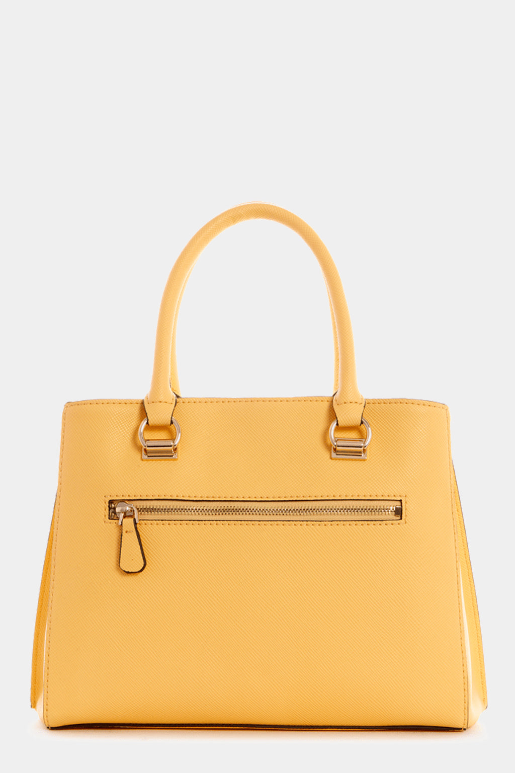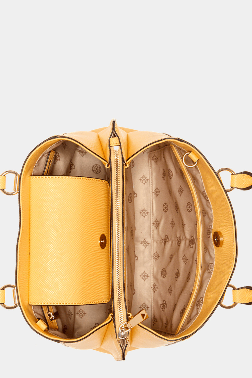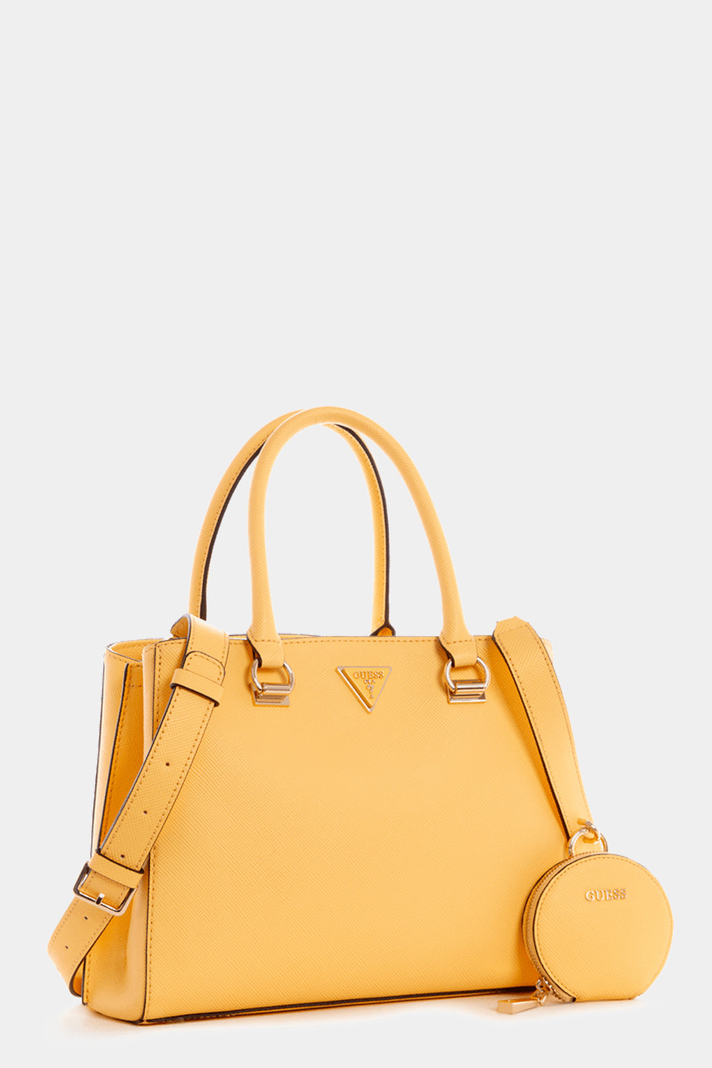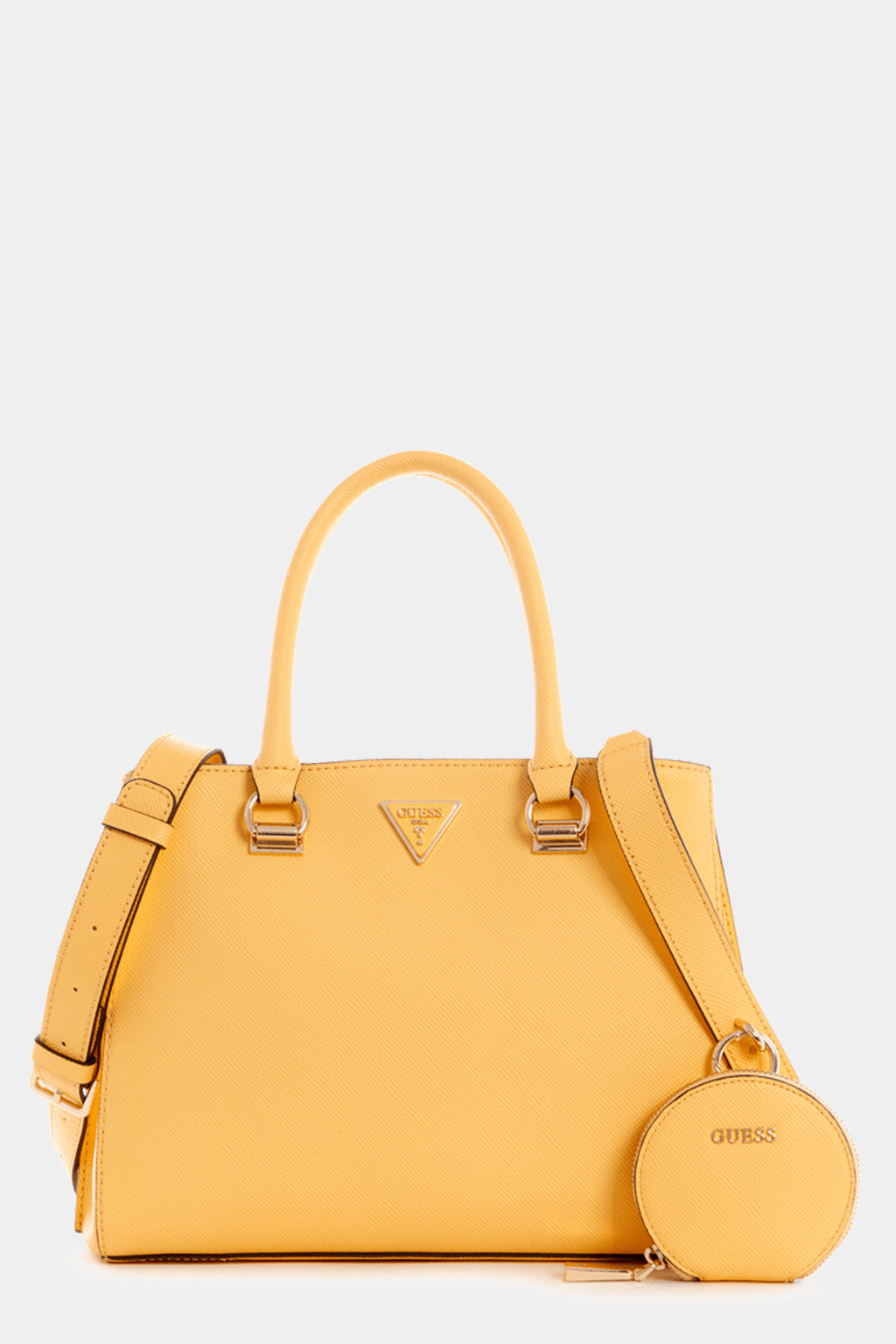 Wallet with double padded shoulder strap and adjustable strap. Solid tone design with Guess triangular logo on the front. With internal pockets, magnetic clasp and zip closure and handle accessory.