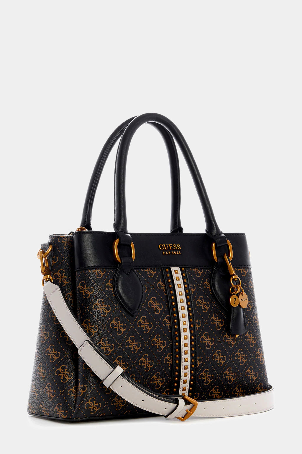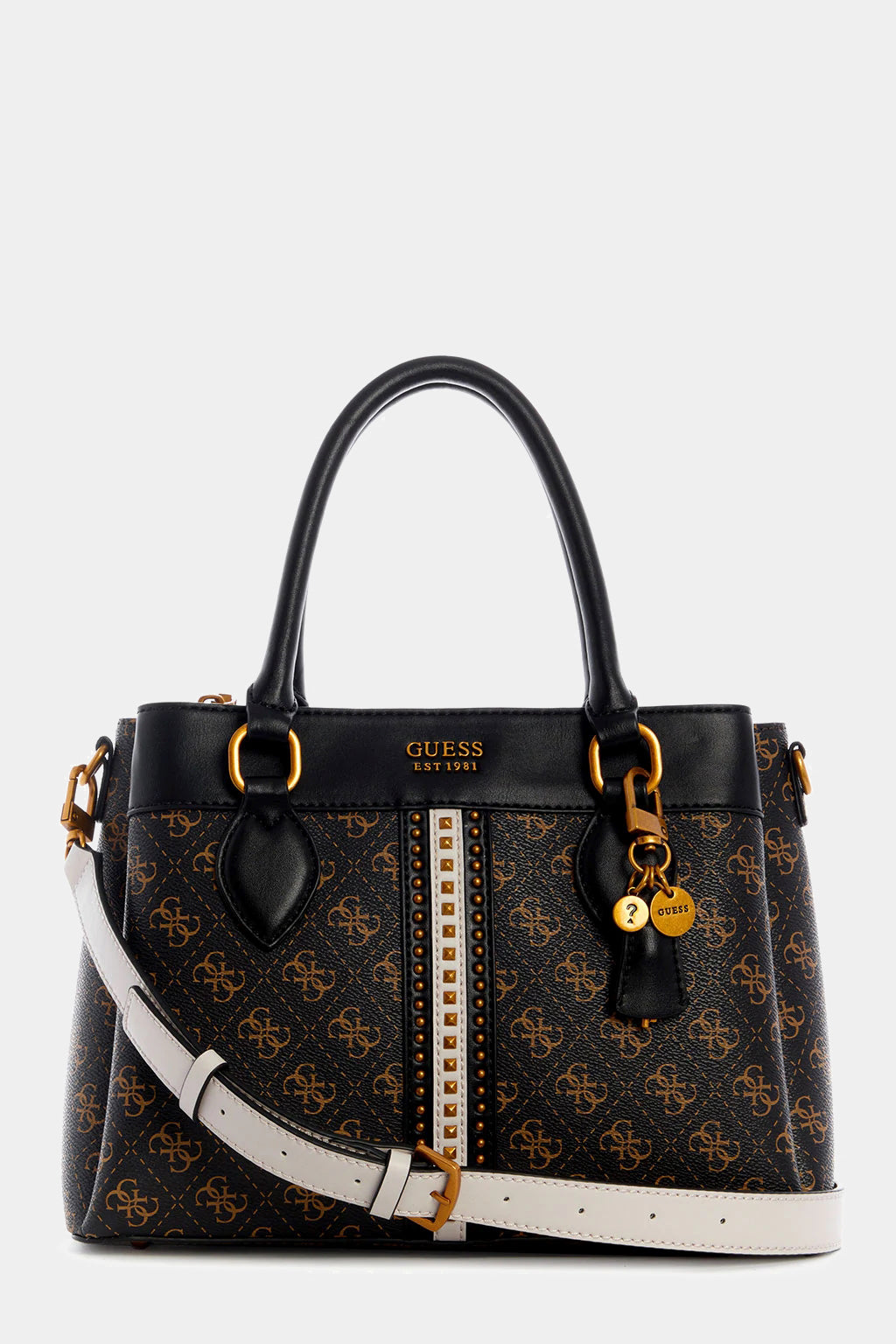 A signature satchel bag with a modern twist, our Brown Kasinta 3 Compartment Satchel is designed with faux leather, antique bronze hardware, logo charms, detachable white crossbody strap and an allover Quattro G logo pattern. The best of all is the handbags’ three compartments which makes it perfect for work or travel or your busy everyday life.