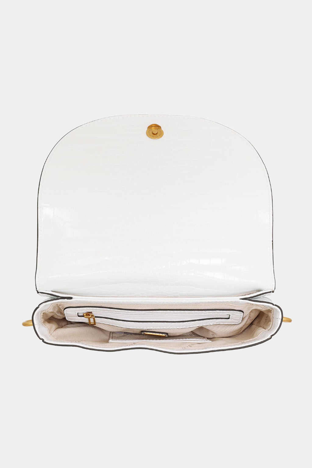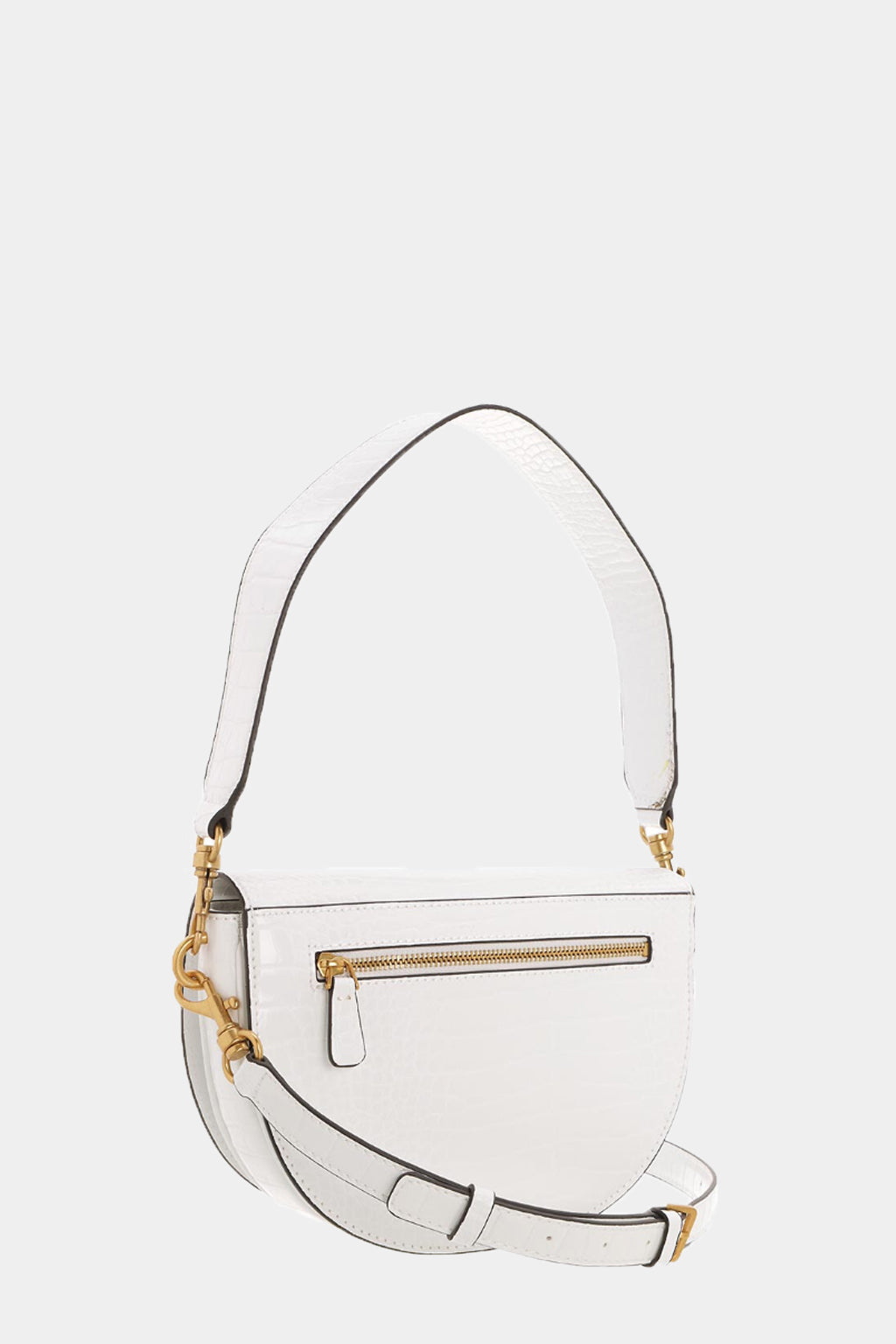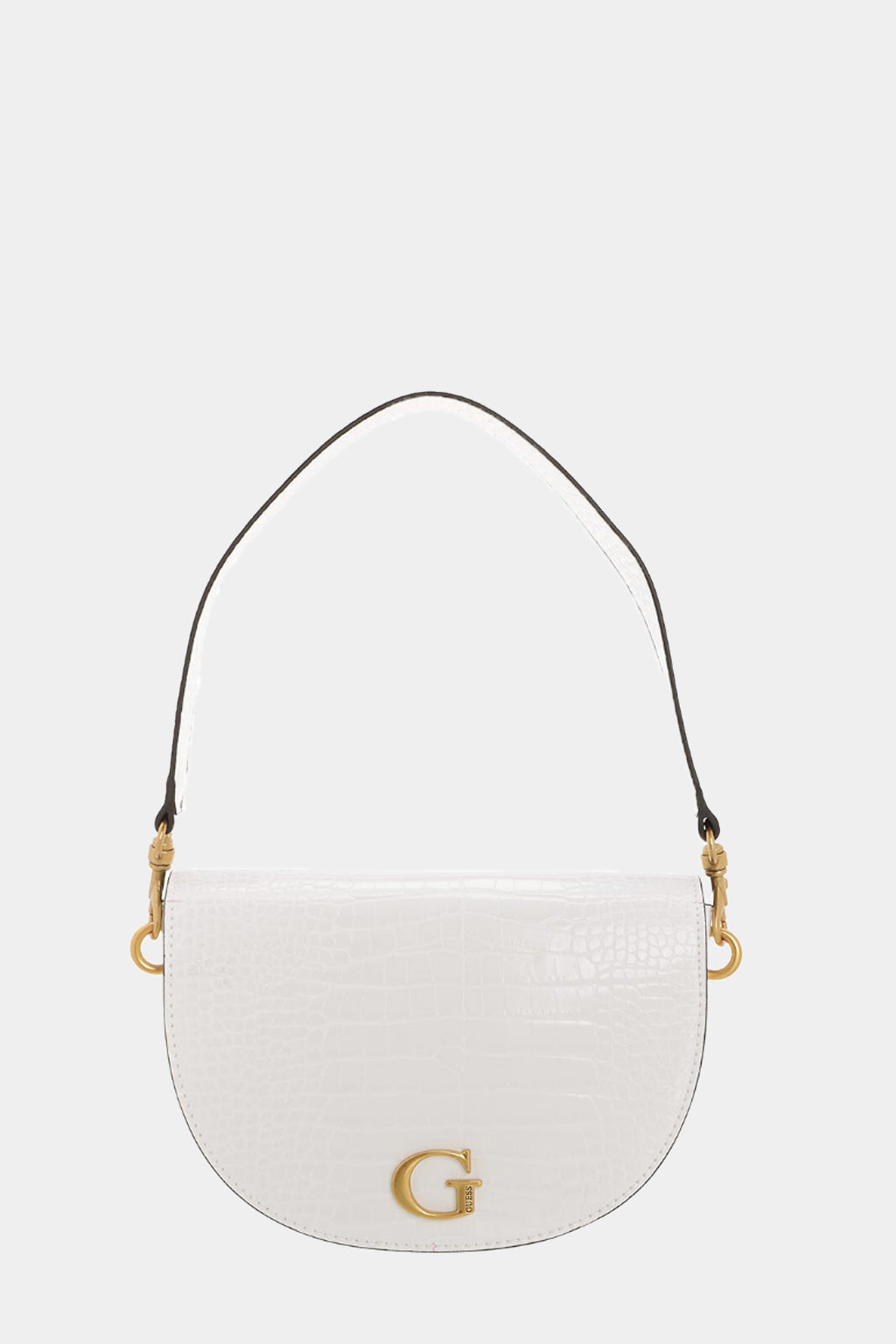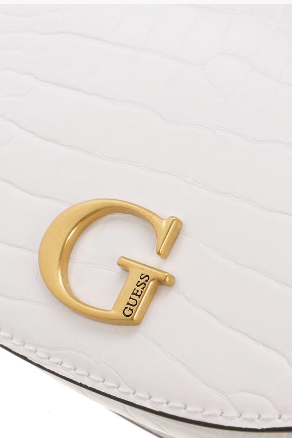 Shoulder bag / Shoulder strap Woman Guess Model Danna Saddle Bag. Made of blue reptile print faux leather. Removable faux leather handle. Removable trap in tinted faux leather, adjustable with buckle. Skating closure with magnetic button. Rear zip pocket. Interior in fabric with zip pocket and envelope pocket. Bronze-colored galvanic.