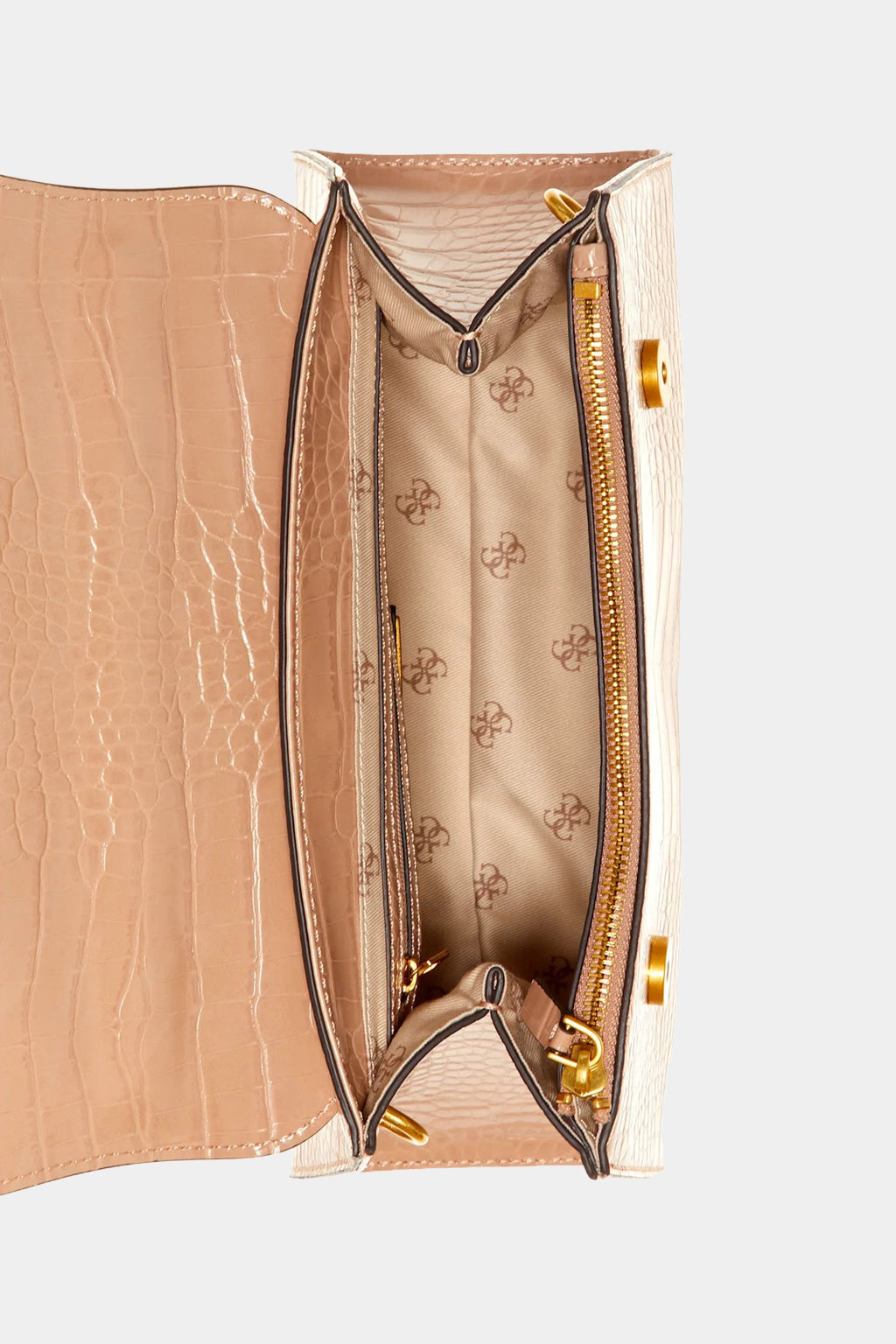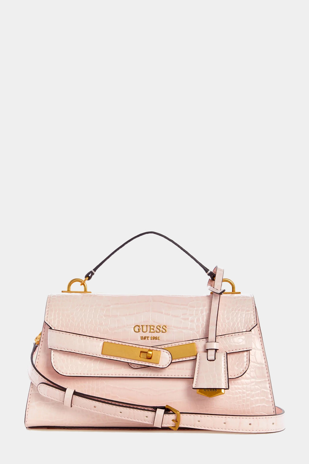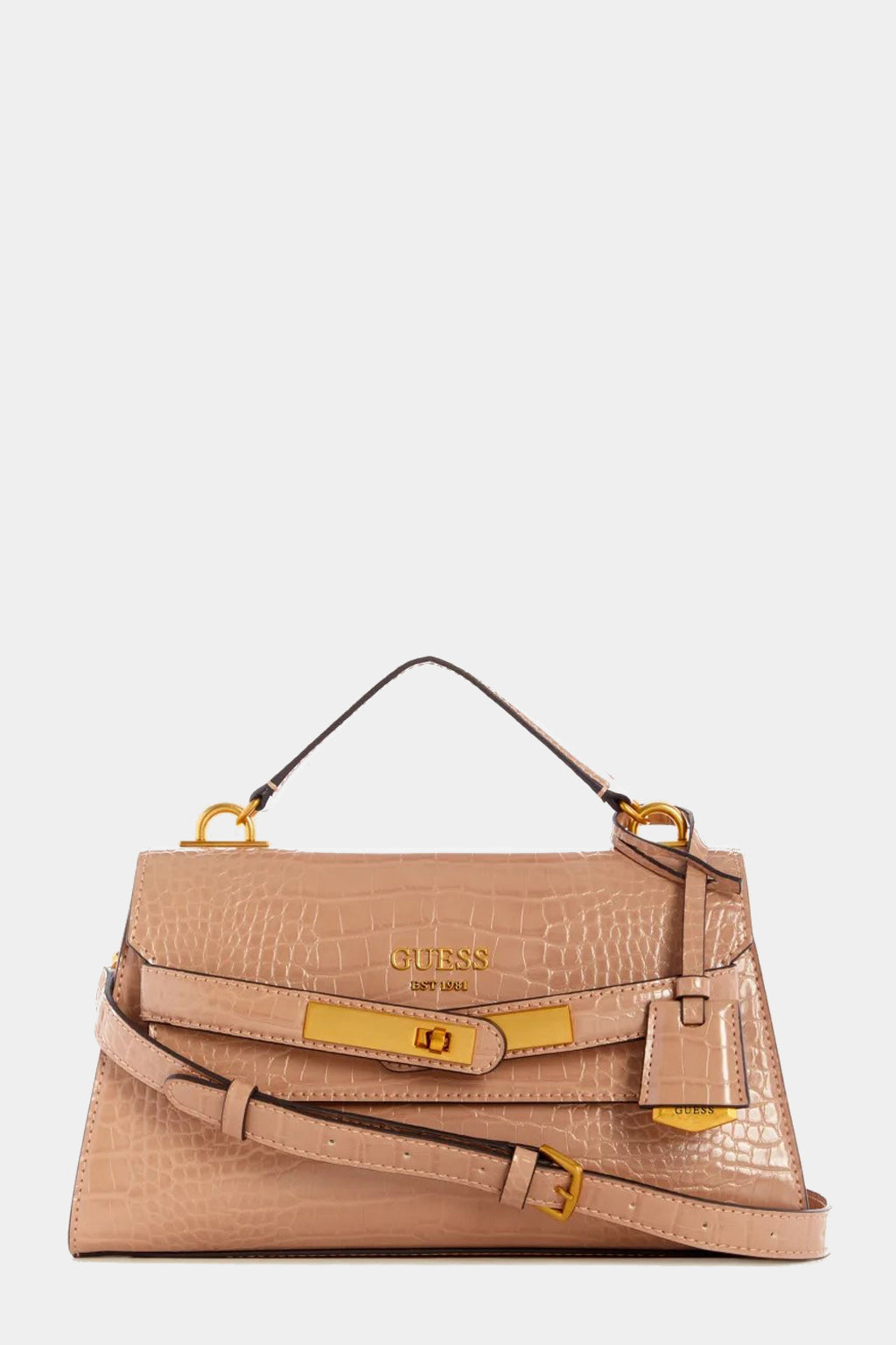 A chic top-handle bag designed with a fold-over flap closer and front belt detail. Crafted in croc-embossed faux leather with a detachable crossbody strap.
