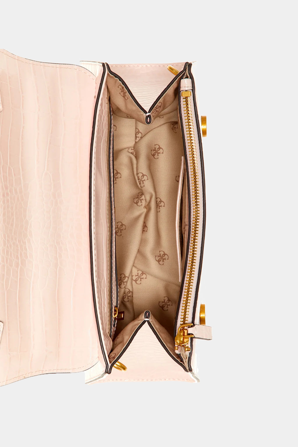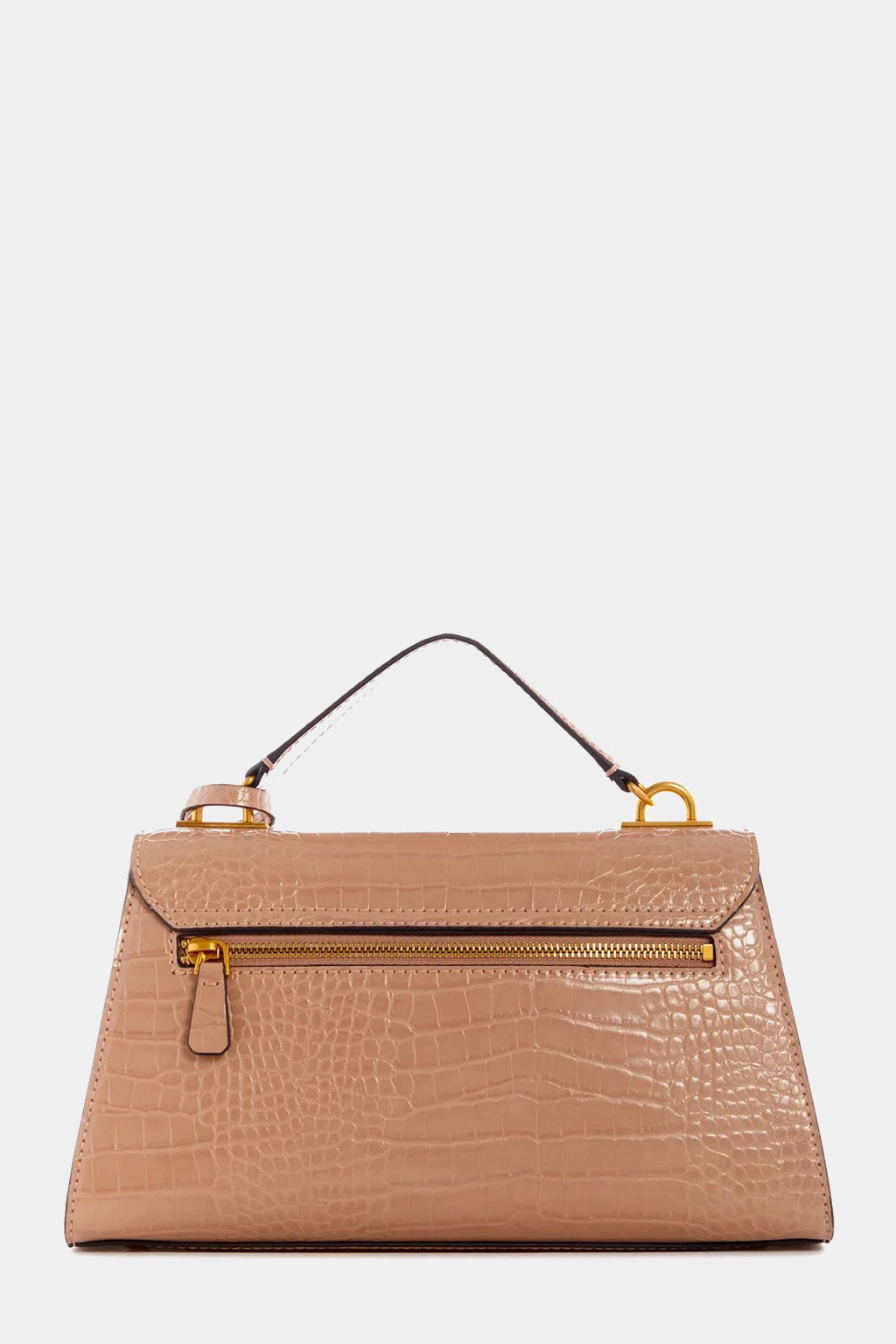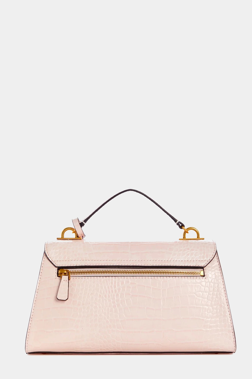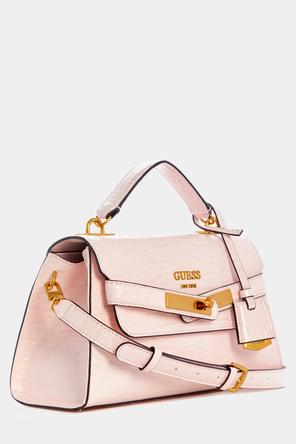 A chic top-handle bag designed with a fold-over flap closer and front belt detail. Crafted in croc-embossed faux leather with a detachable crossbody strap.