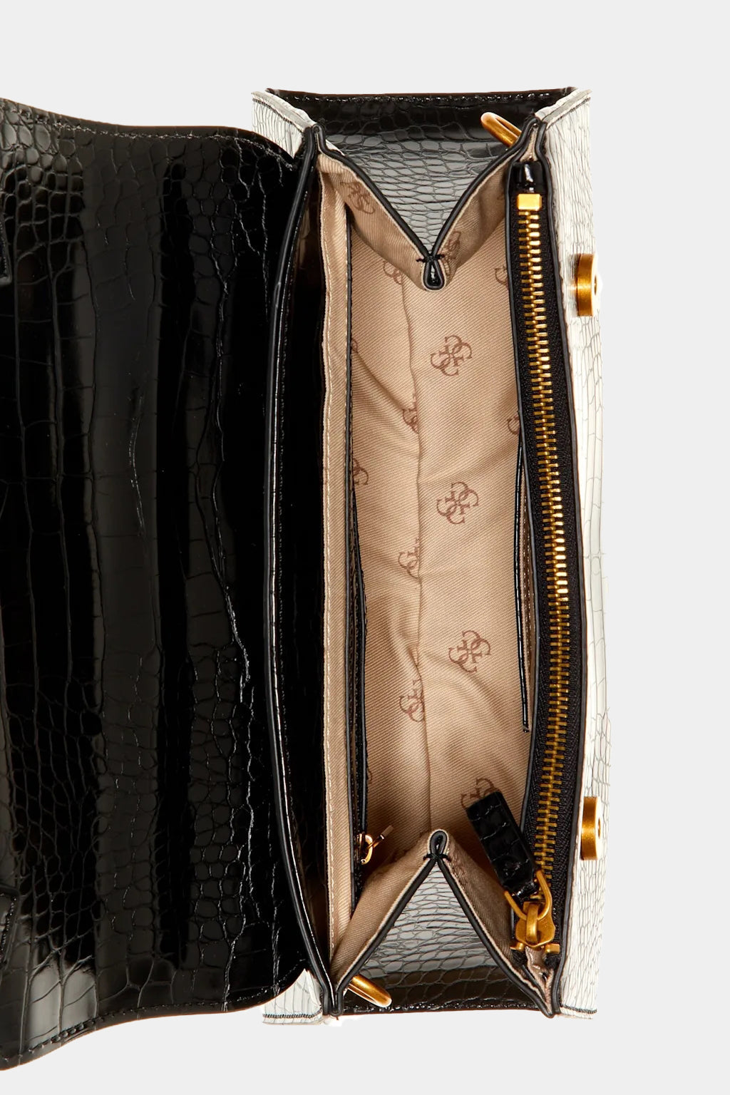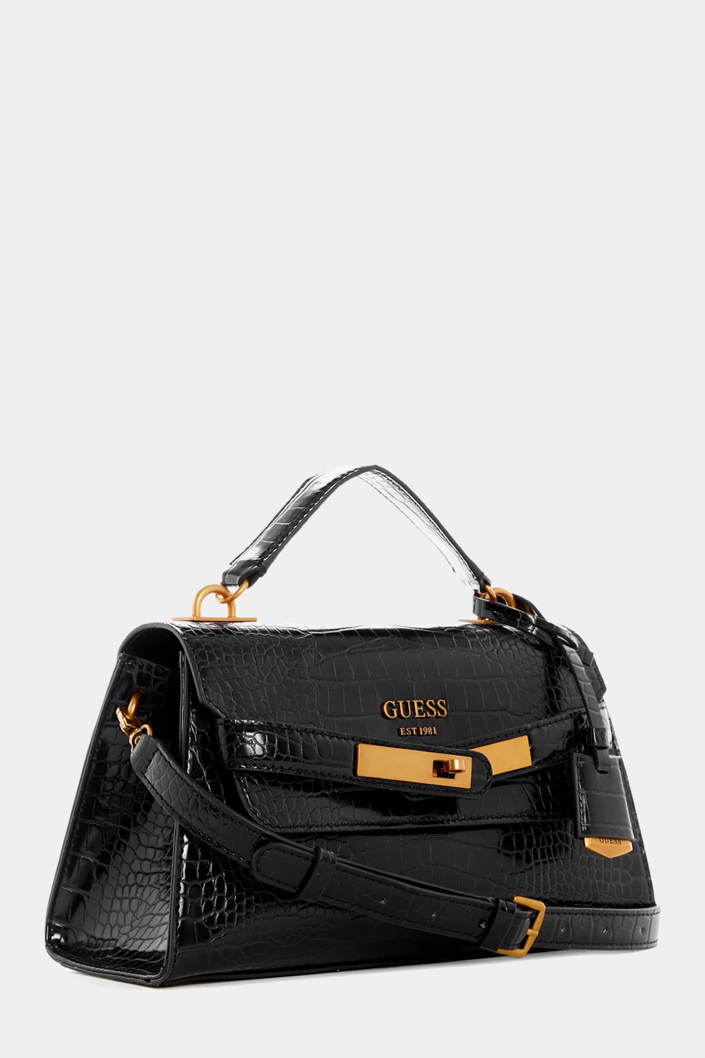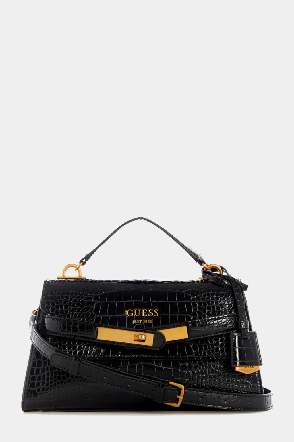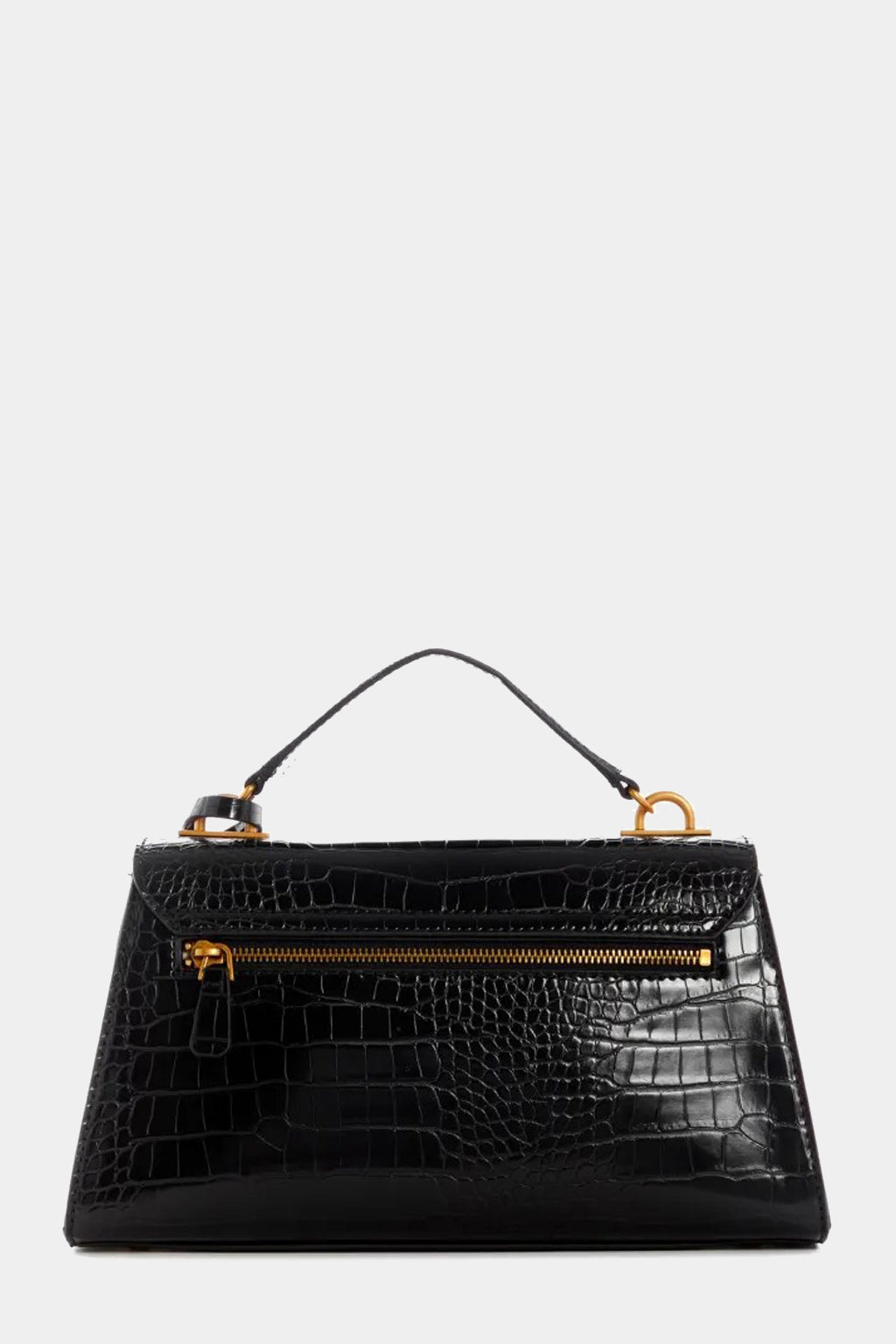A chic top-handle bag designed with a fold-over flap closer and front belt detail. Crafted in croc-embossed faux leather with a detachable crossbody strap.