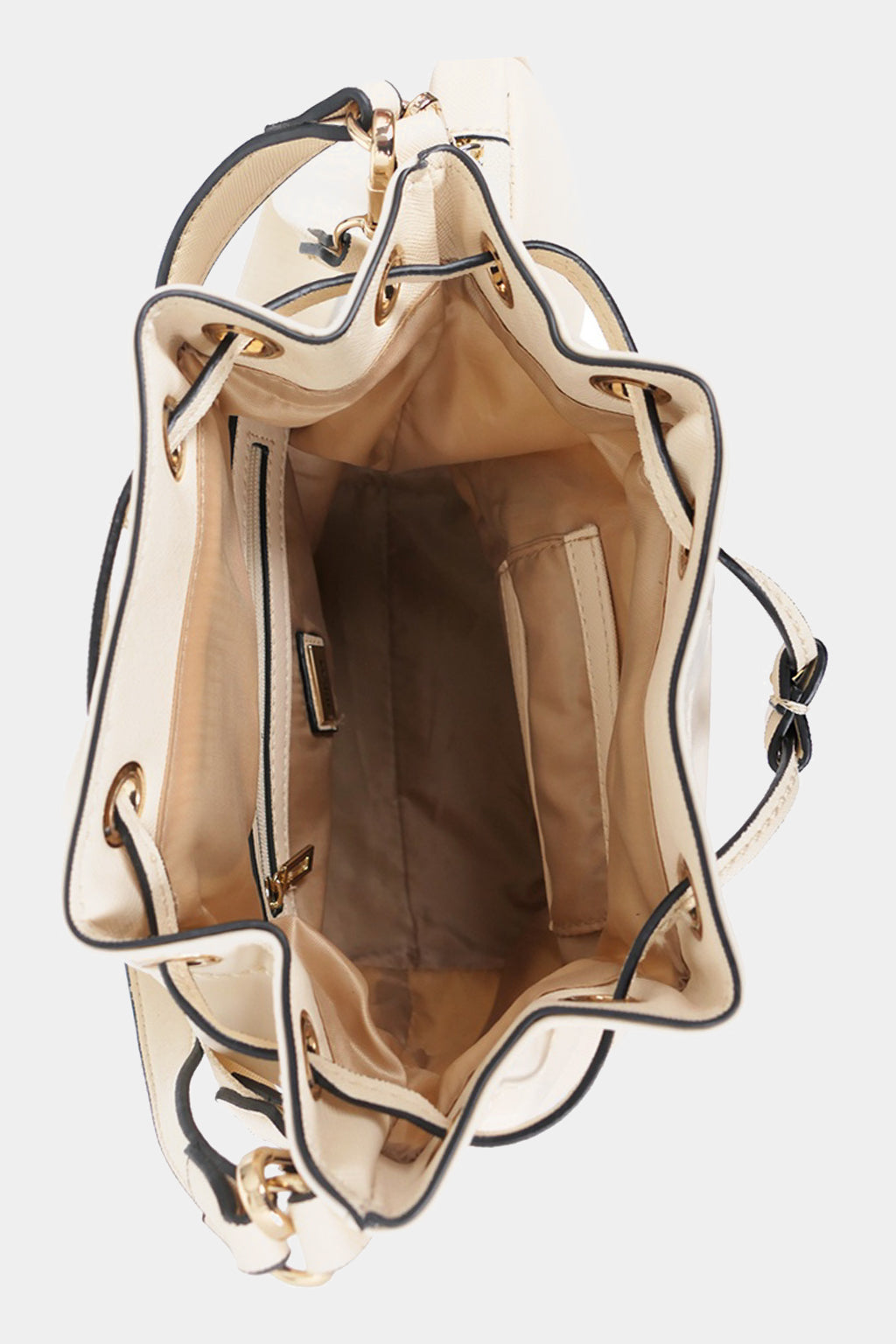The Guess Women's Bag Lina Drawstring Bucket is a stylish and functional accessory. It features an adjustable shoulder strap, a single compartment for easy storage, and slip pockets for added convenience, an ideal choice for fashion-conscious women.
