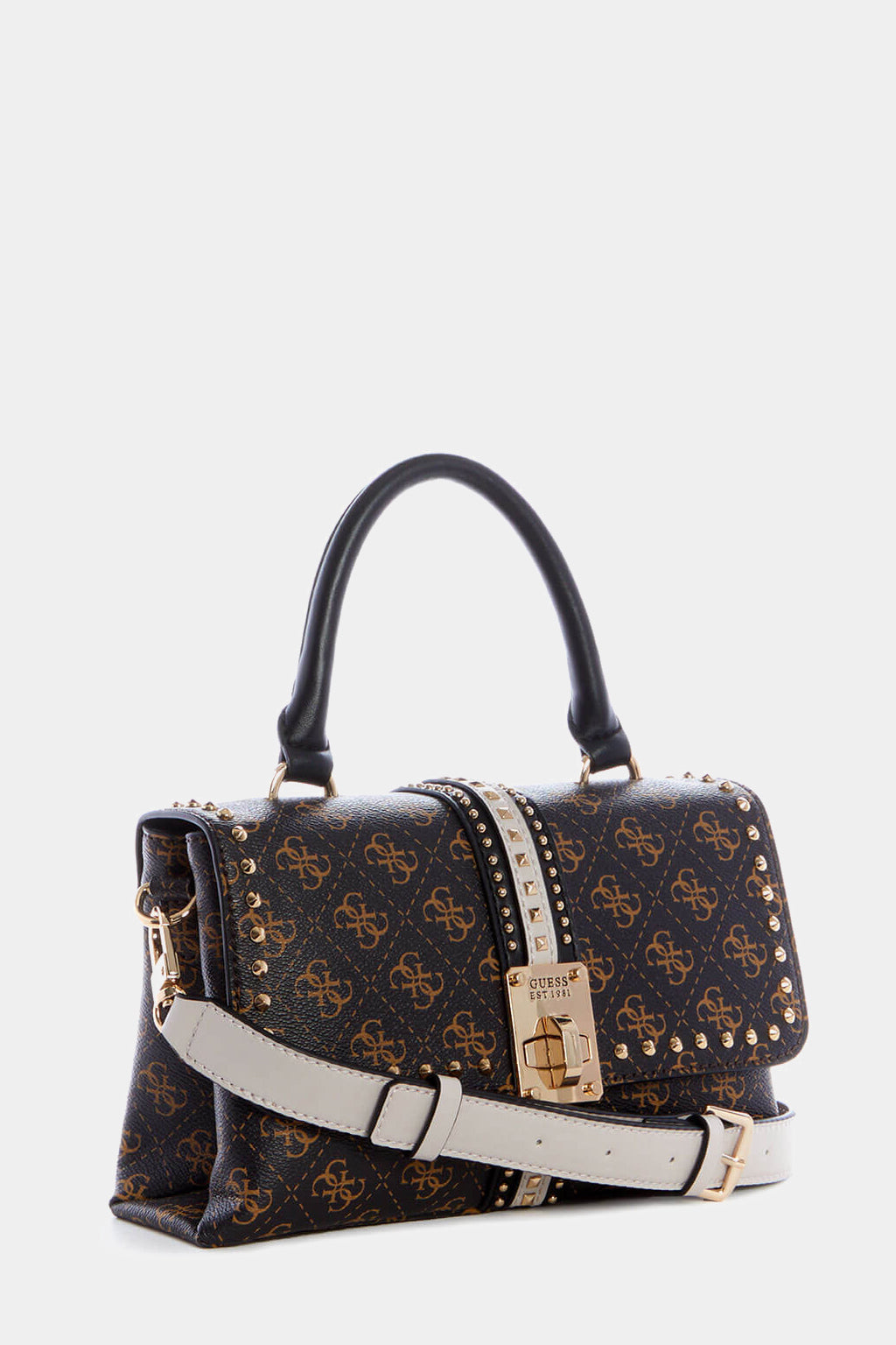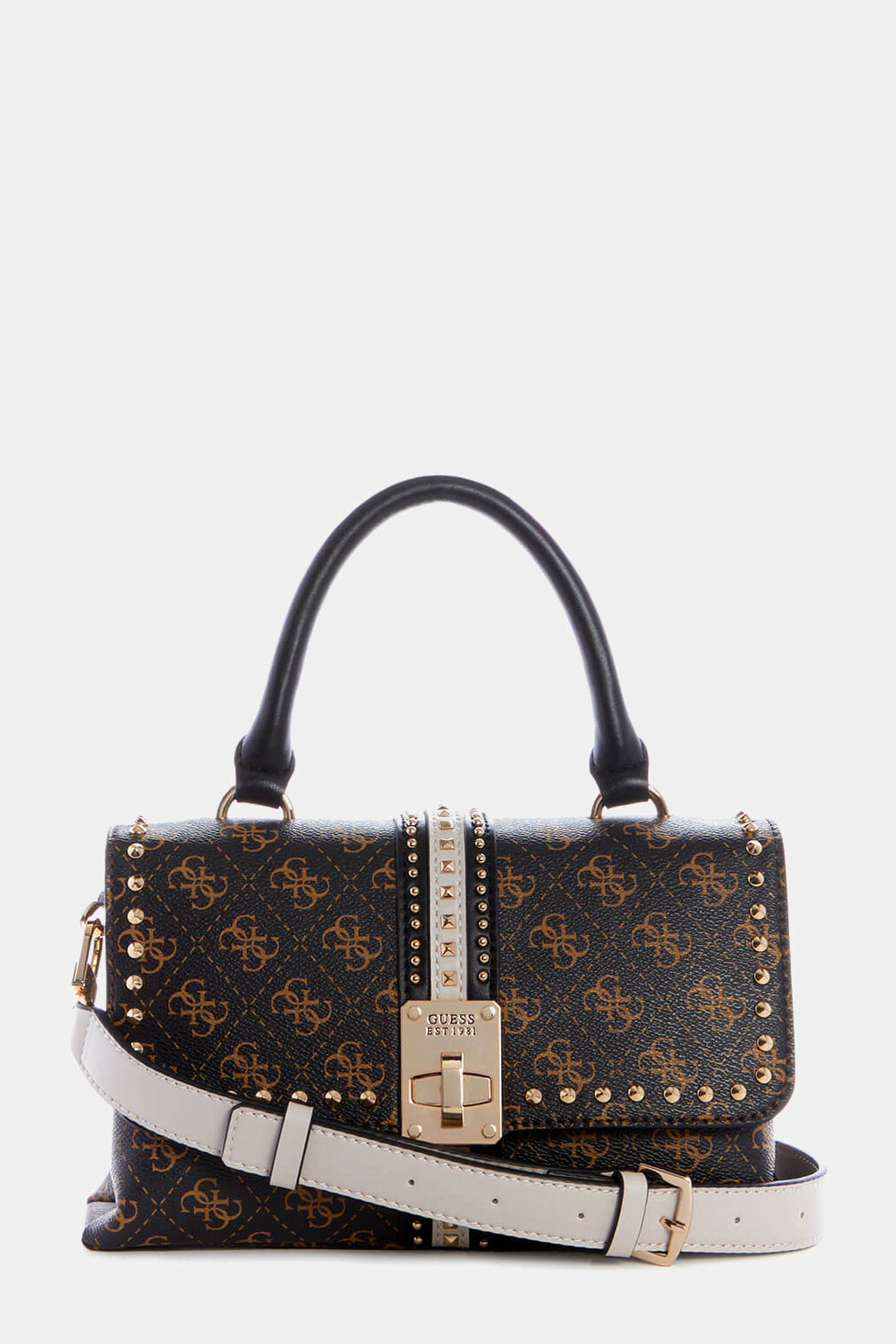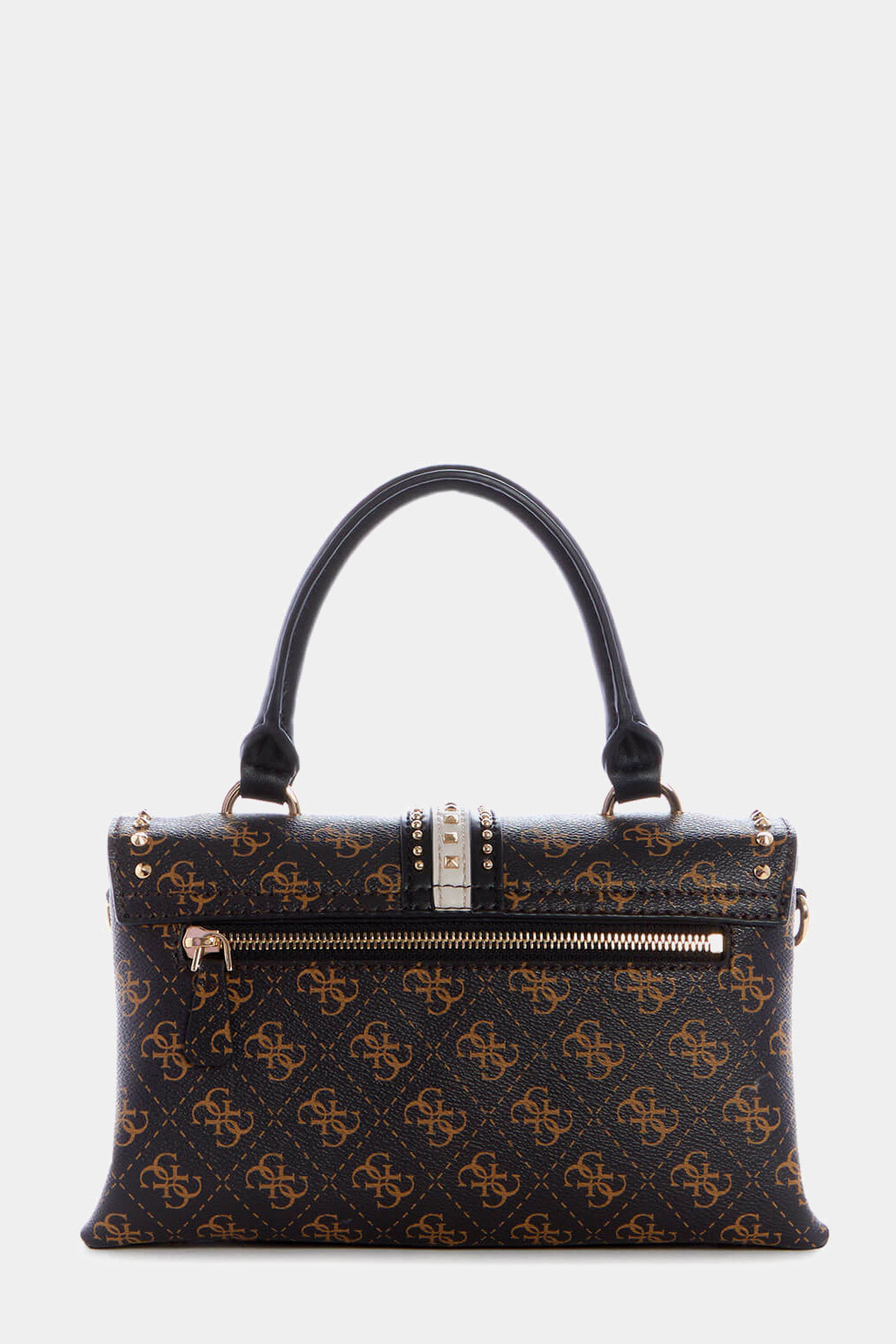 A classic handbag brought to life by Guess, our Brown Kasinta Satchel will become your new favorite. Featuring a Quattro G logo PU base, antique bronze hardware, two compartments, hardware twist flap closure and your choice of a cross body strap or top handle, this handbag will take you from desk to dinner.