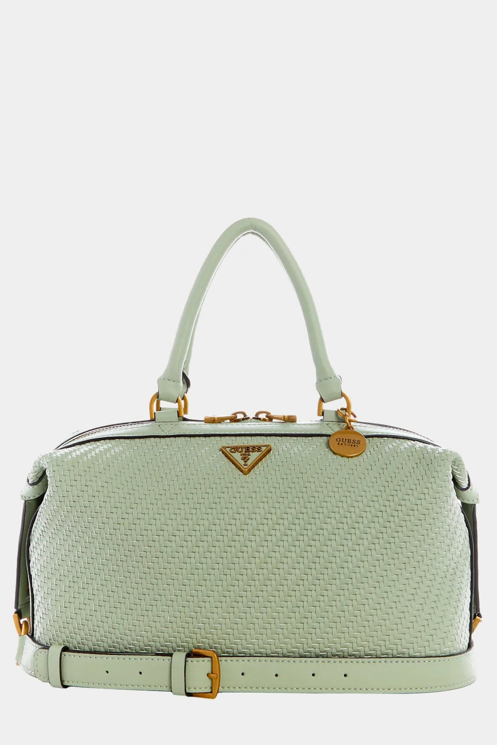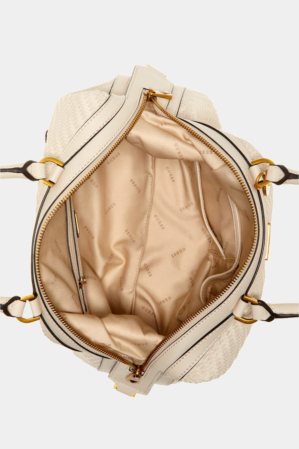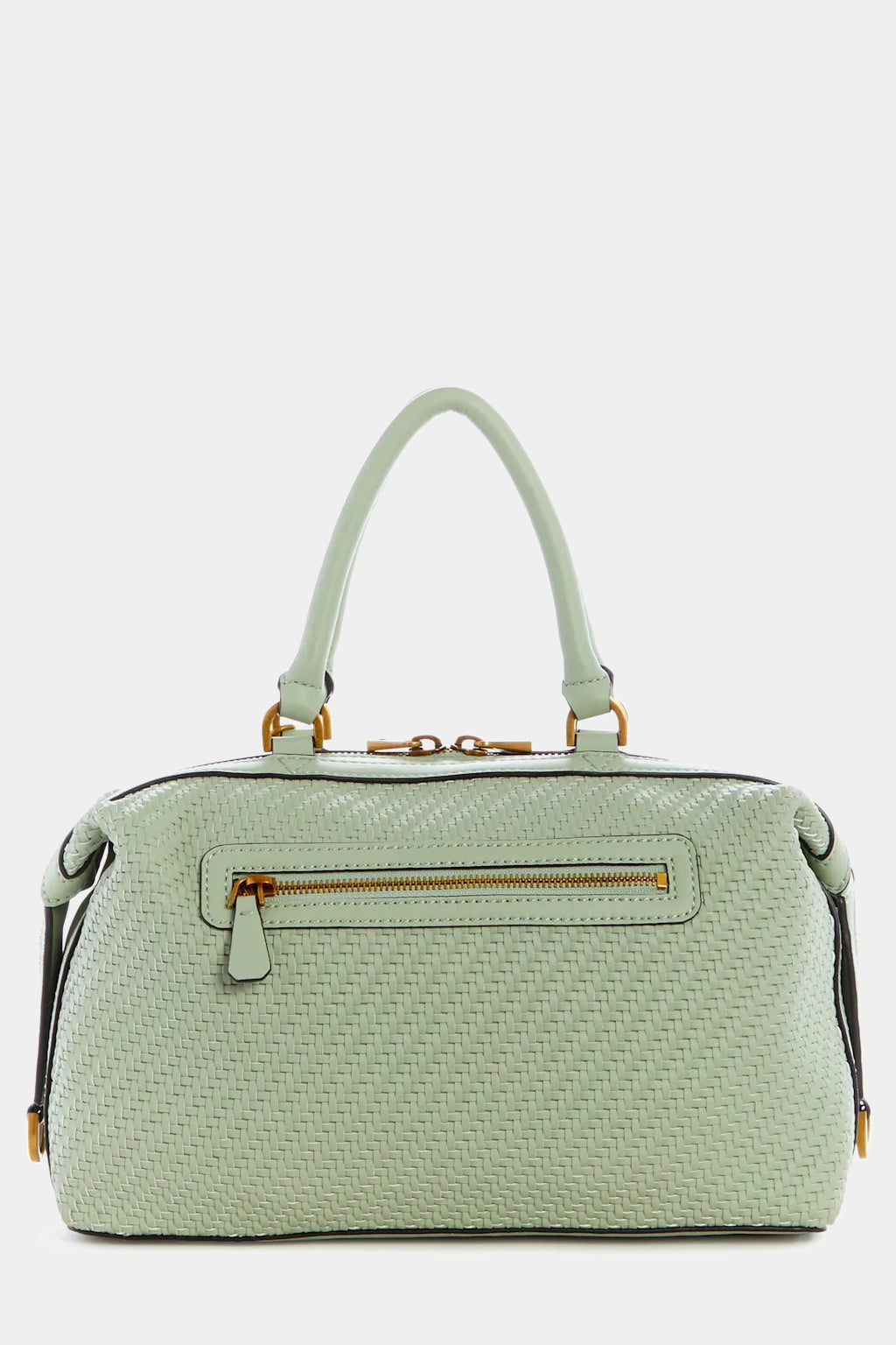 Constructed in an updated woven faux-leather composition, this standout satchel features dual rolled top handles, a logo emblem and detachable crossbody strap. Top zip closure.