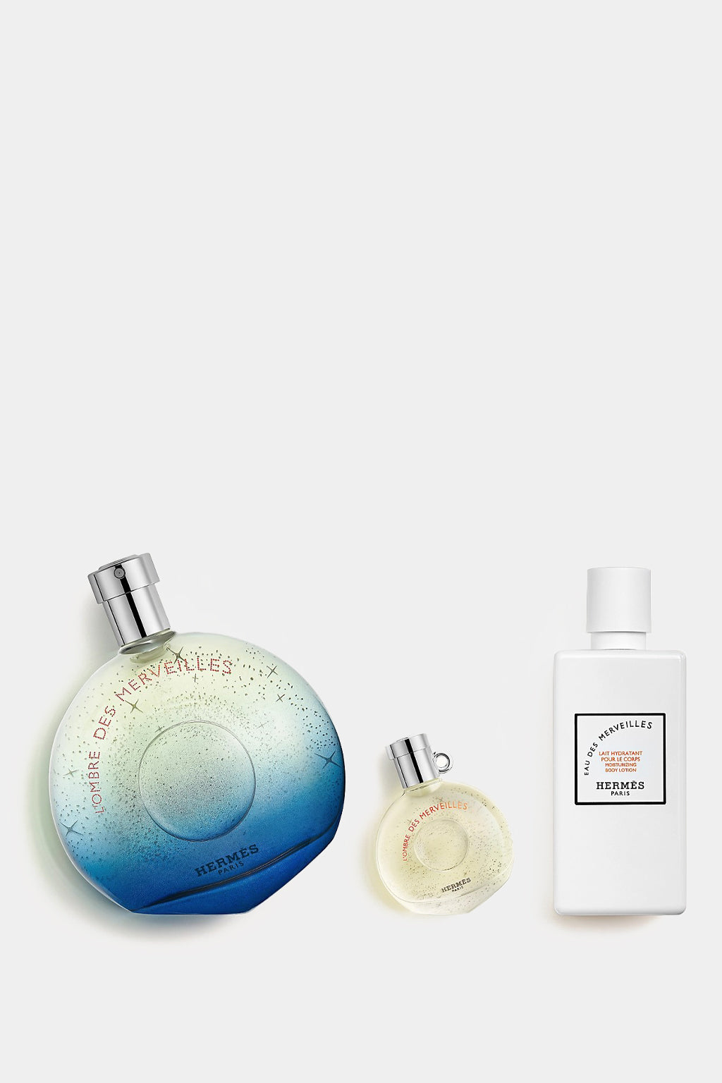 The L'Ombre des Merveilles gift set comprises one 100 ml eau de parfum spray, one 7.5 ml miniature eau de parfum and one 80 ml Eau des Merveilles moisturizing body lotion.