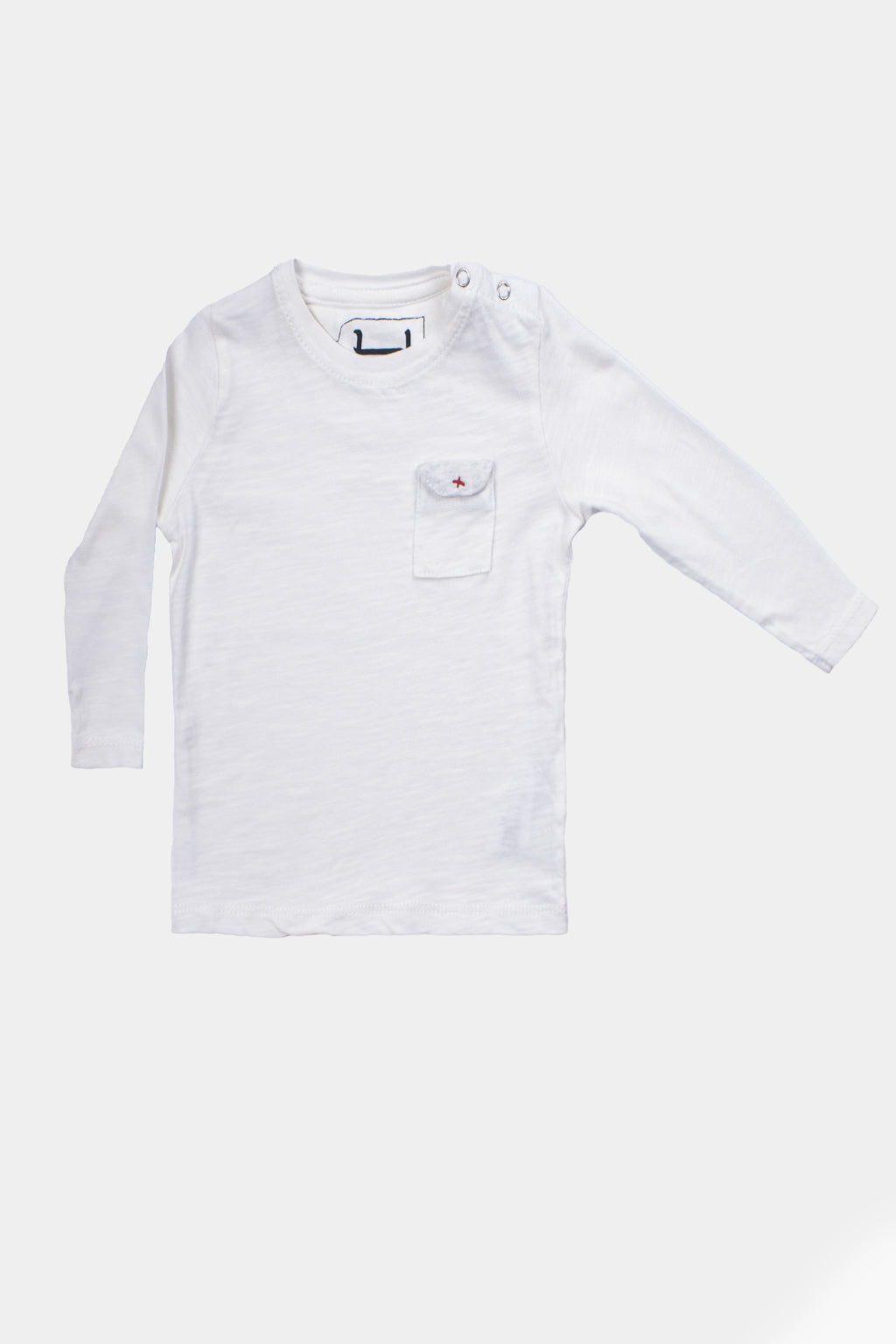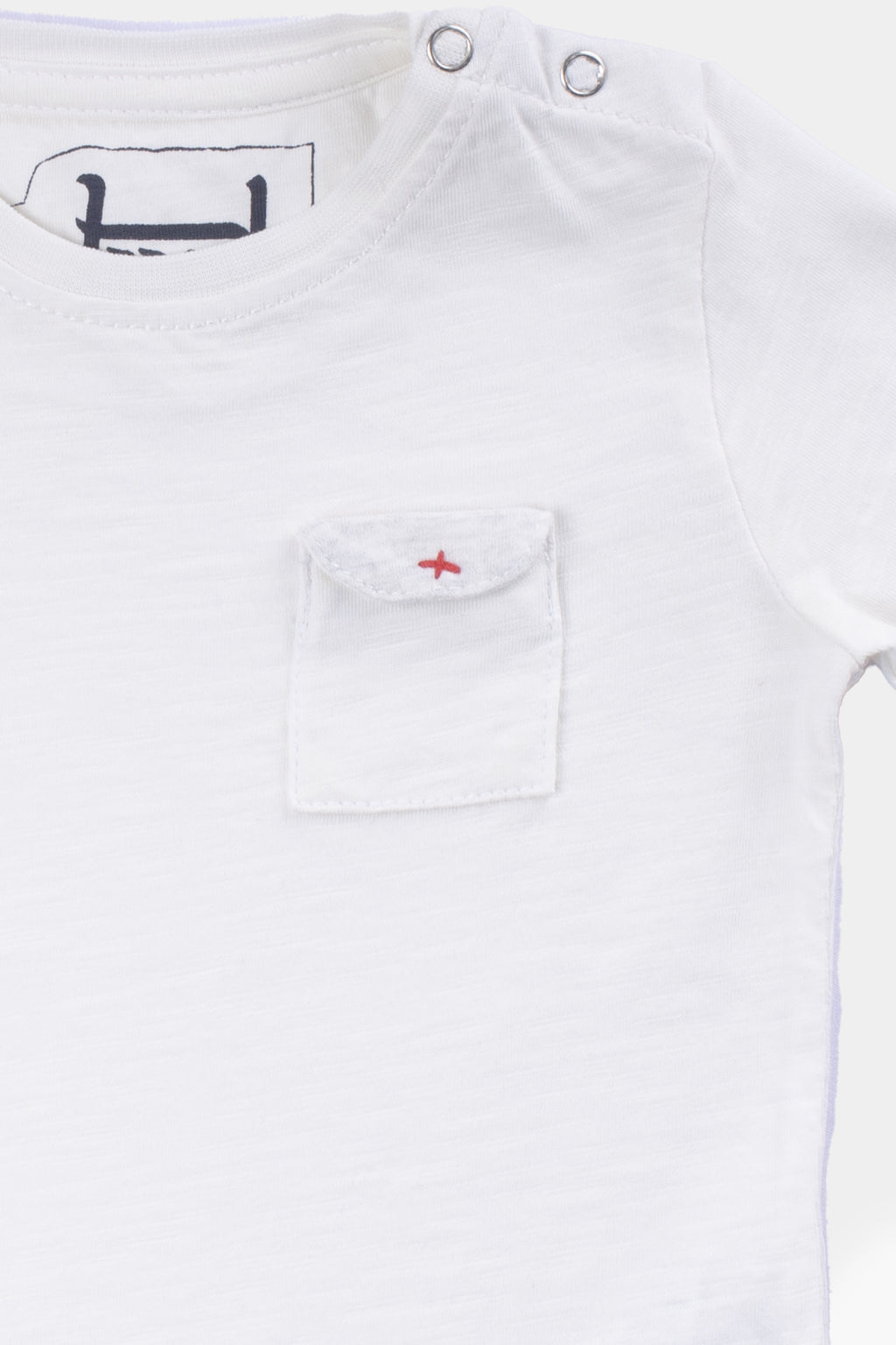 This t-shirt is perfect for the summer. It is short sleeve and round neck. It is made of cotton. It has a button on the shoulder and a pocket on the left side.