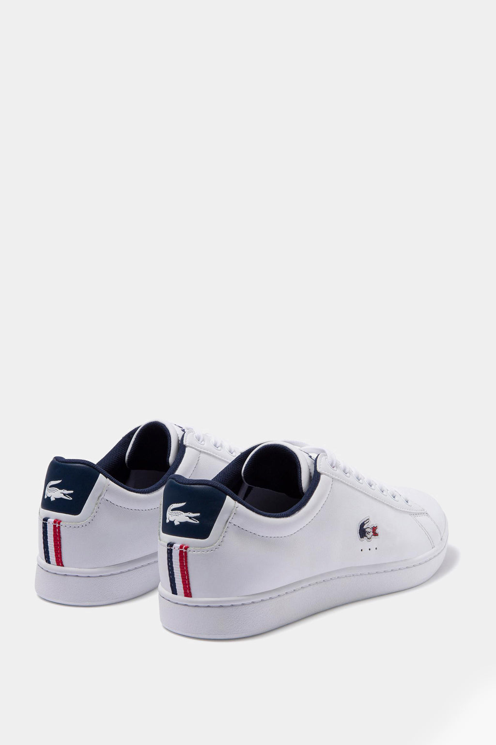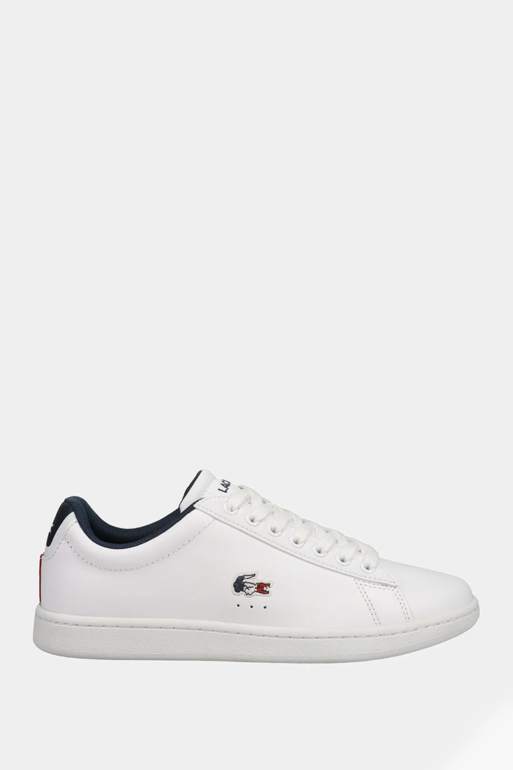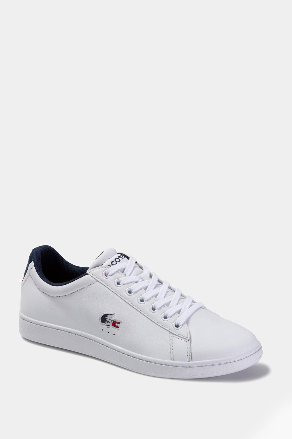 Sleek white uppers add to the easy elegance of this lace-up sneaker. The simple silhouette is complete with detailing that references Lacoste's tennis heritage, like perforations on the quarter. A color-pop heel tab elevates the premium leather construction, with Tricolor webbing on the heel and tongue top. The design is finished with a coordinating Tricolor embroidered crocodile at the quarter.