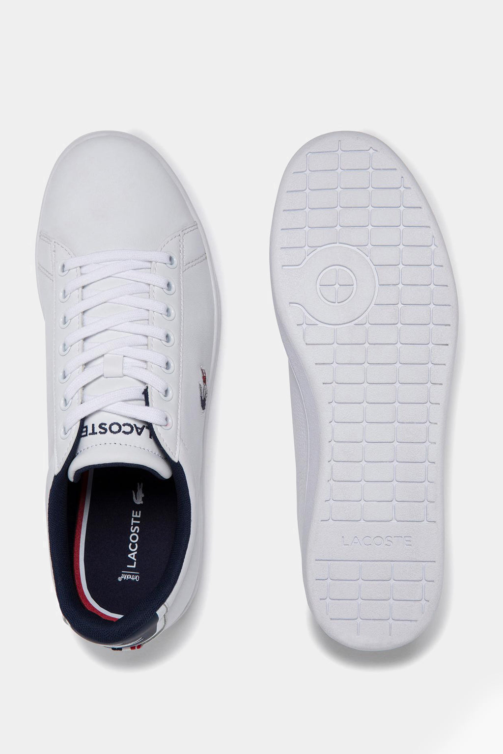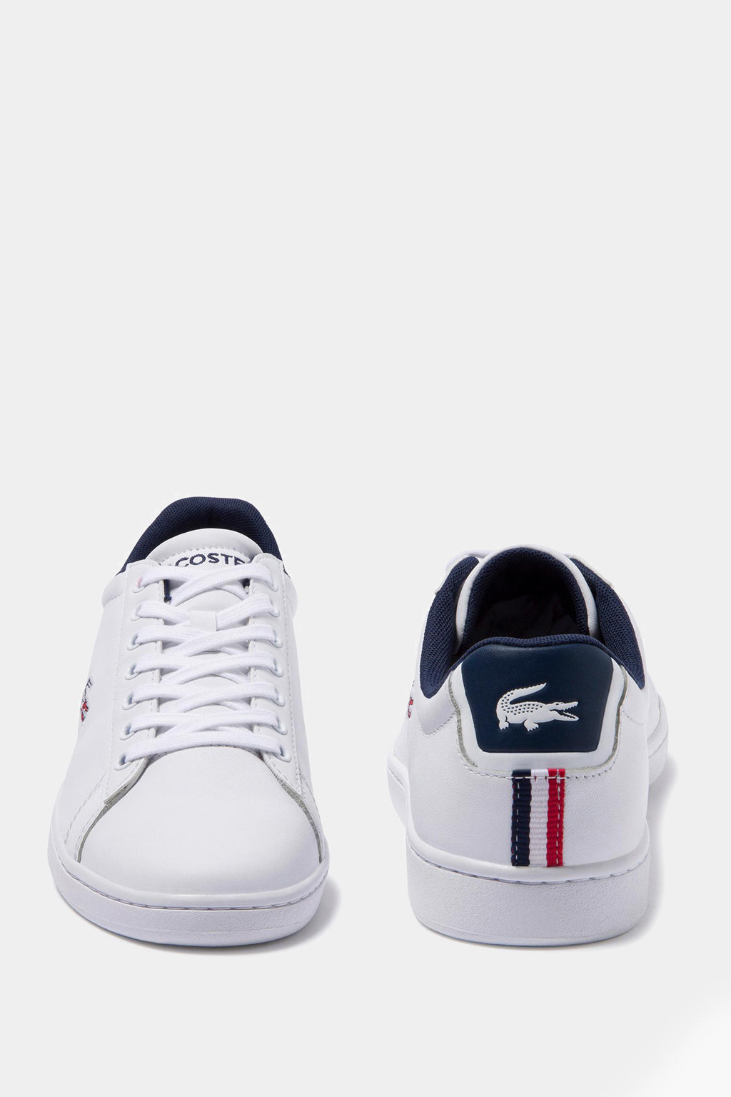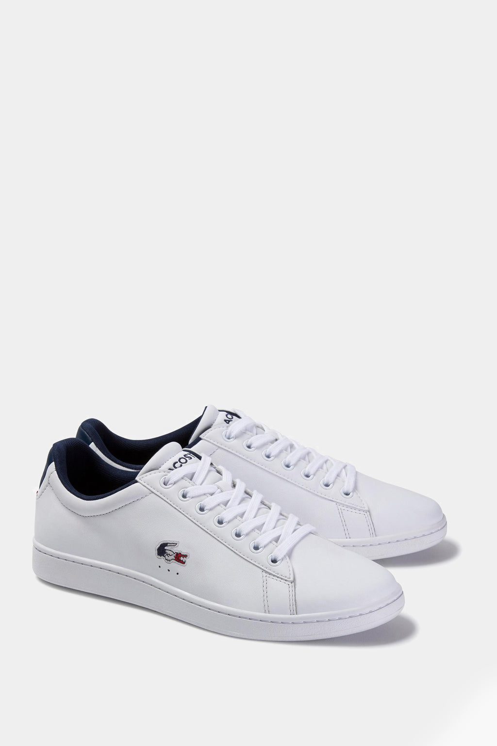 Sleek white uppers add to the easy elegance of this lace-up sneaker. The simple silhouette is complete with detailing that references Lacoste's tennis heritage, like perforations on the quarter. A color-pop heel tab elevates the premium leather construction, with Tricolor webbing on the heel and tongue top. The design is finished with a coordinating Tricolor embroidered crocodile at the quarter.