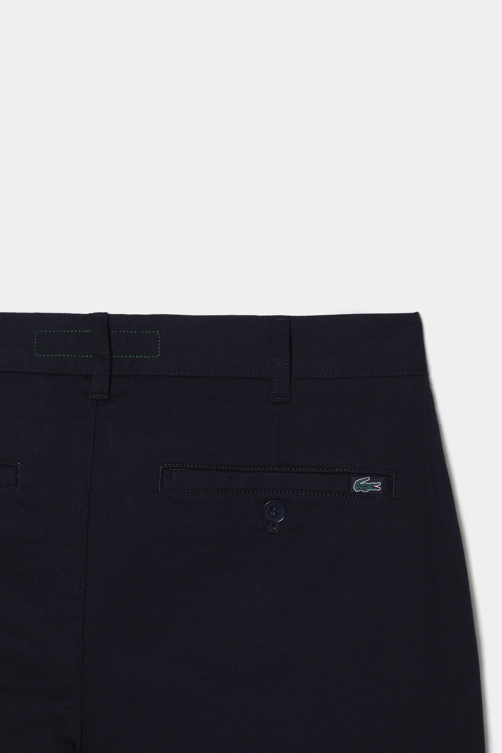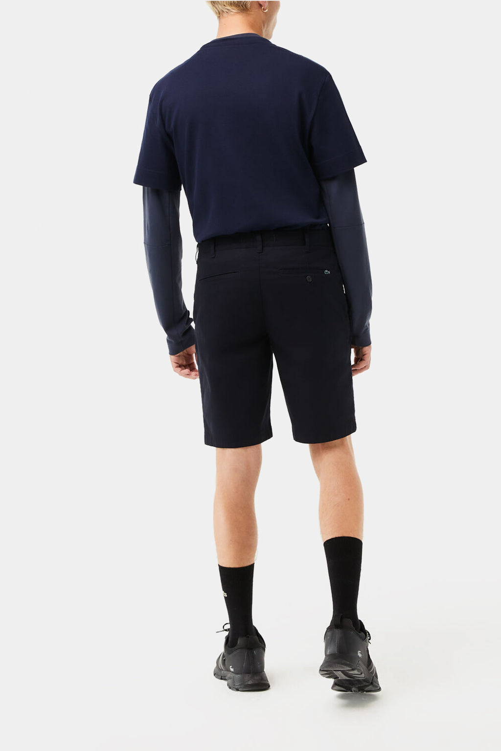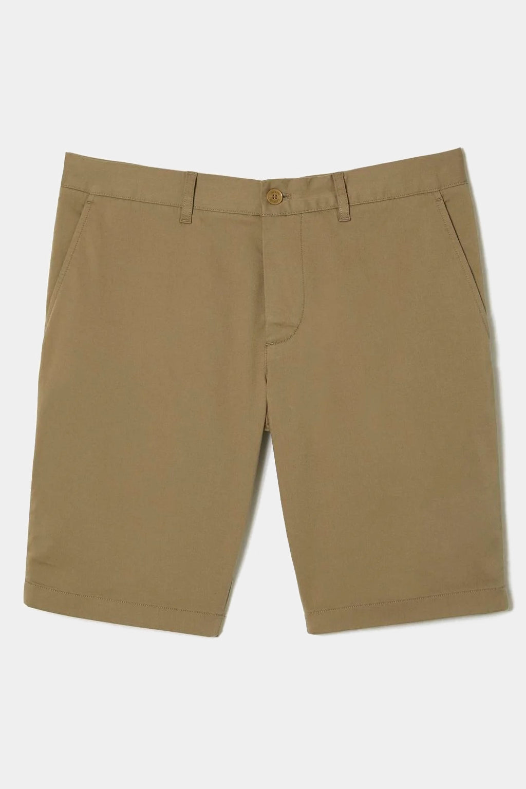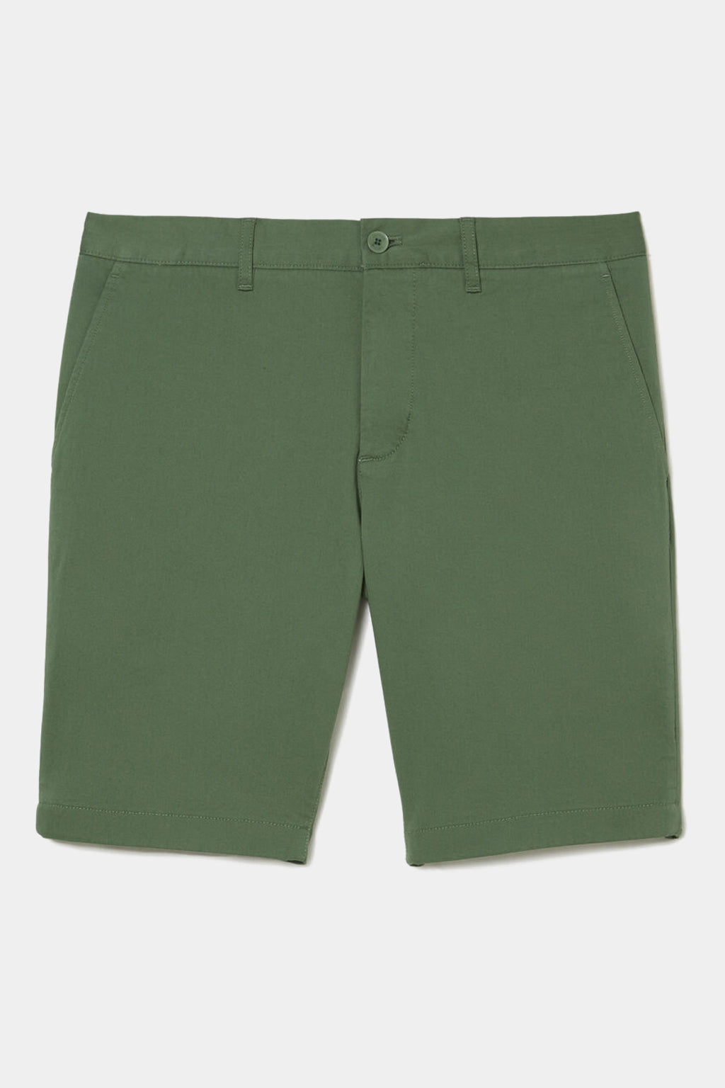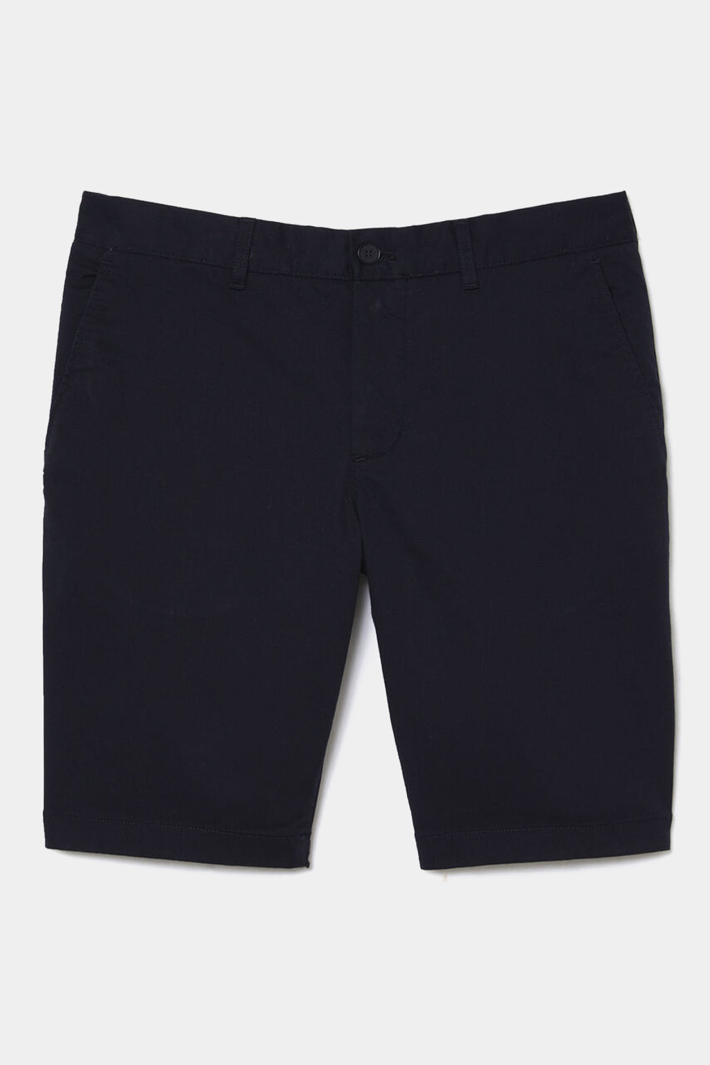 Men's Lacoste Stretch Chino Short. A slim fitting, classic chino short constructed in a lightweight cotton fabric. Features zip fly and button closure, constructed belt loops, front slash pockets and rear pockets.