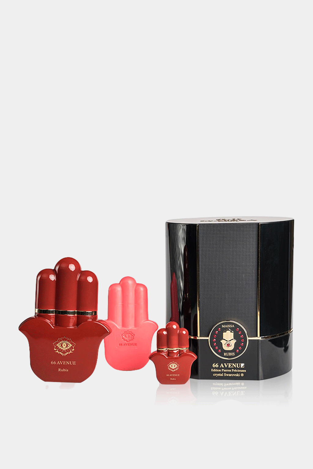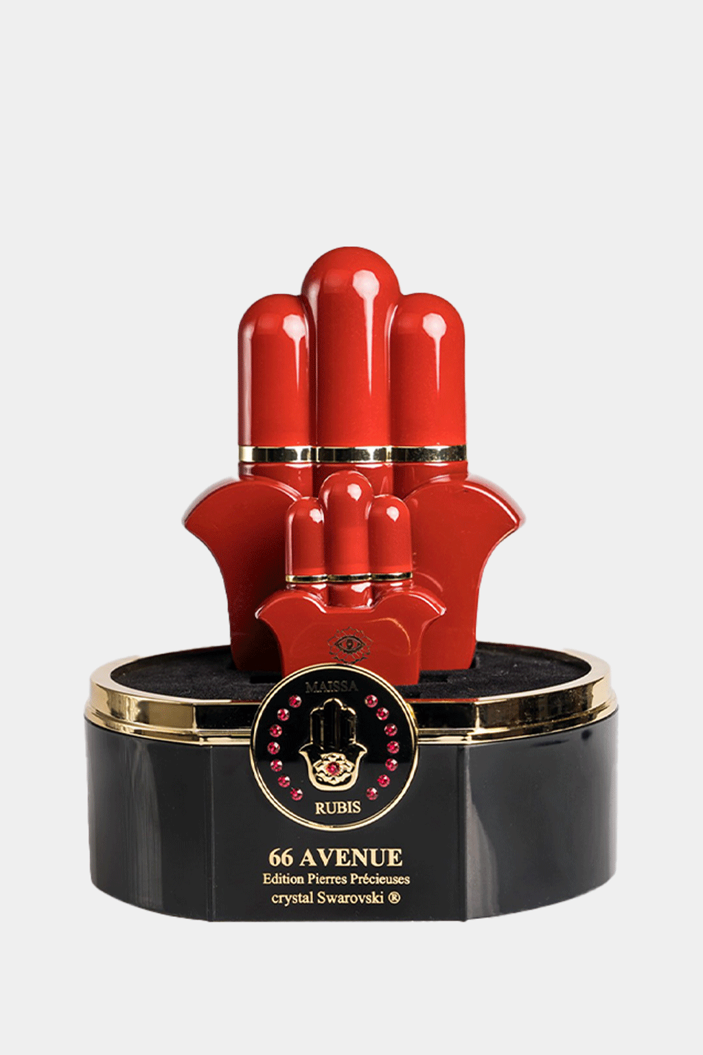 Experience the luxurious and captivating scent of Maissa - 66 Avenue Set Eau De Parfum. The unique box design is adorned with radiant Rubies, symbolizing eternal beauty. Bergamot and patchouli bring a freshness to the scent, while white wood and amber add a mystical touch. Immerse yourself in the journey of the Silk Road with this exceptional fragrance.