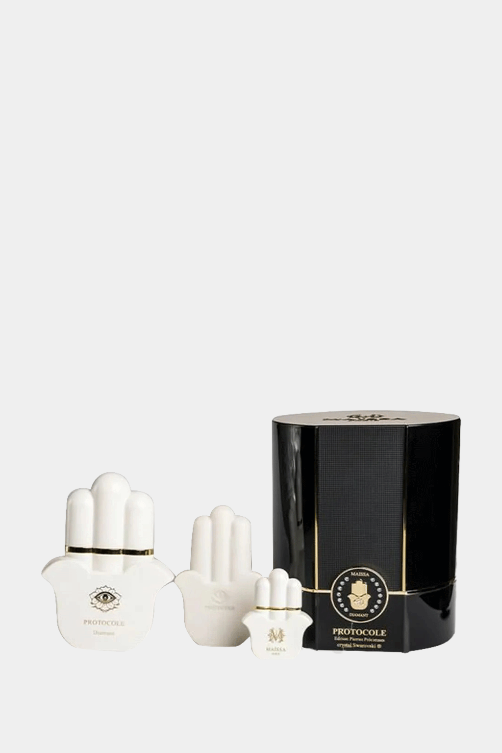 Experience the perfection of Maissa - Protocole Set. Each box contains a unique character, enhanced by sublime eternity diamonds. Let the elegant and chic fragrance envelop you with spicy and herbal notes, while the intoxicating scent of patchouli, Bulgarian rose, and vanilla express their nobility on every skin.