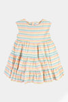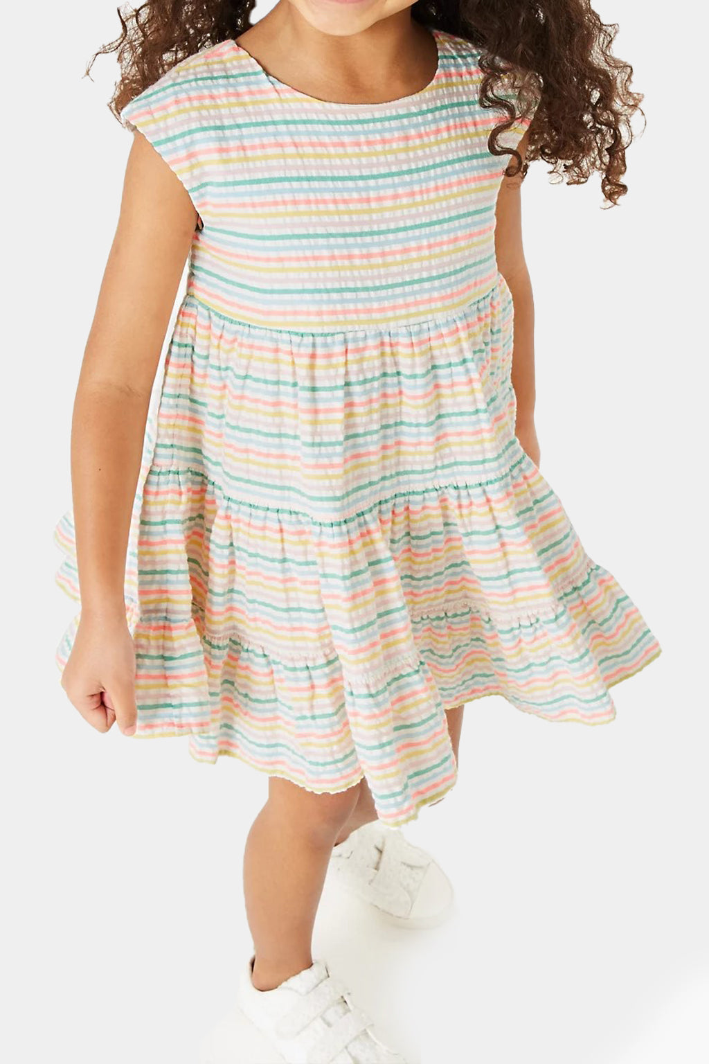 Kit kids out for beach days in this lightweight seersucker dress. Tiered silhouette gives them plenty of room to move. This multicoloured striped design has a softly crinkled finish for a unique look. All of the cotton for our clothing is sustainably sourced and always will be.