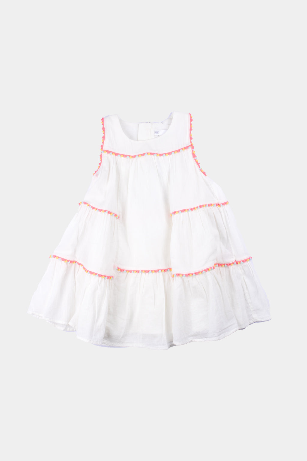 Kit kids out for beach days in this lightweight seersucker dress. Tiered silhouette gives them plenty of room to move. This multicoloured striped design has a softly crinkled finish for a unique look. All of the cotton for our clothing is sustainably sourced and always will be.