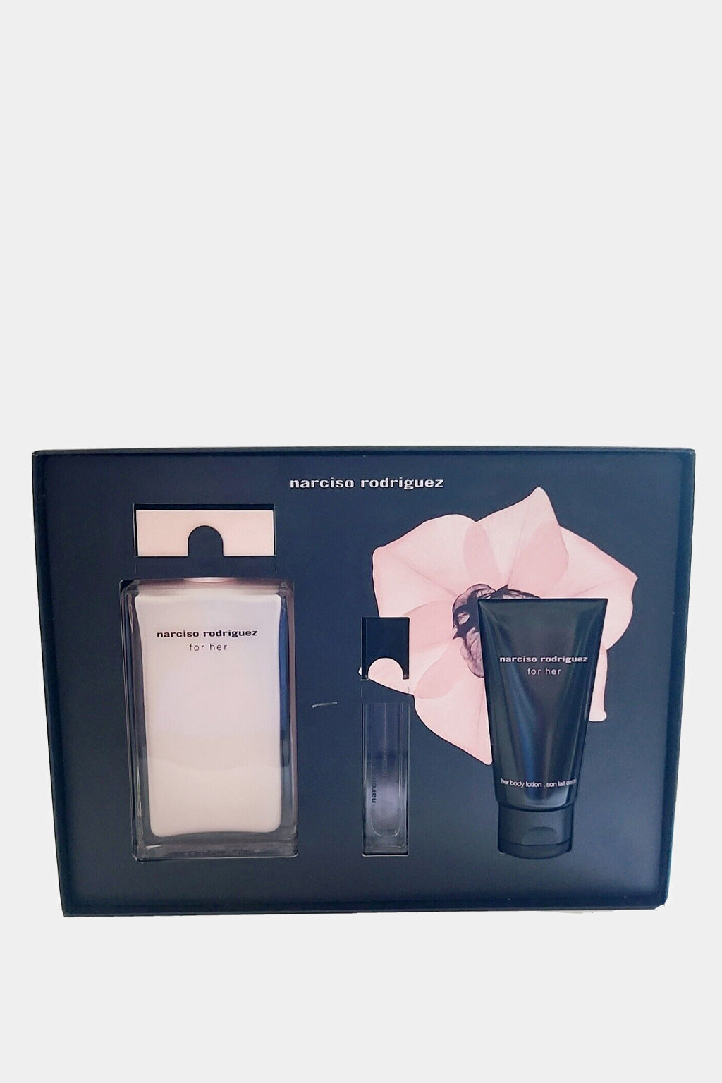 Narciso Rodriguez for her is a floral and musky fragrance. The Narciso Rodriguez perfume opens with contrasting notes of rose, peach and musk, which blend into the floral heart with orange blossom and osmanthus notes. The base contains vetiver, amber and vanilla notes for a sweet yet musky finish, which complement each other beautifully.