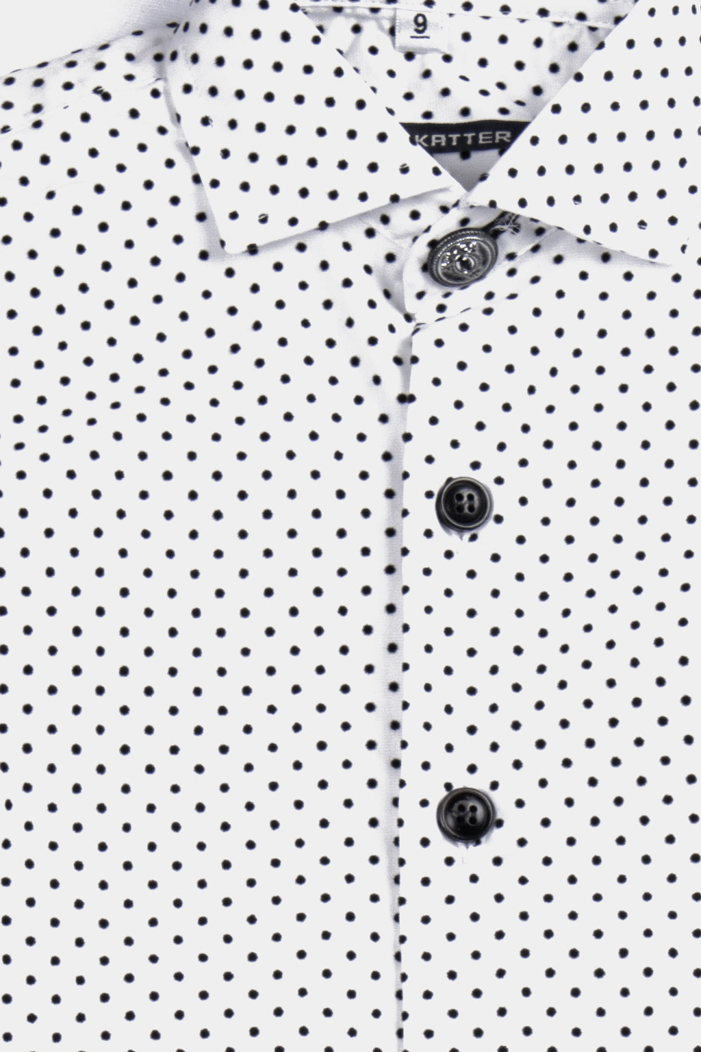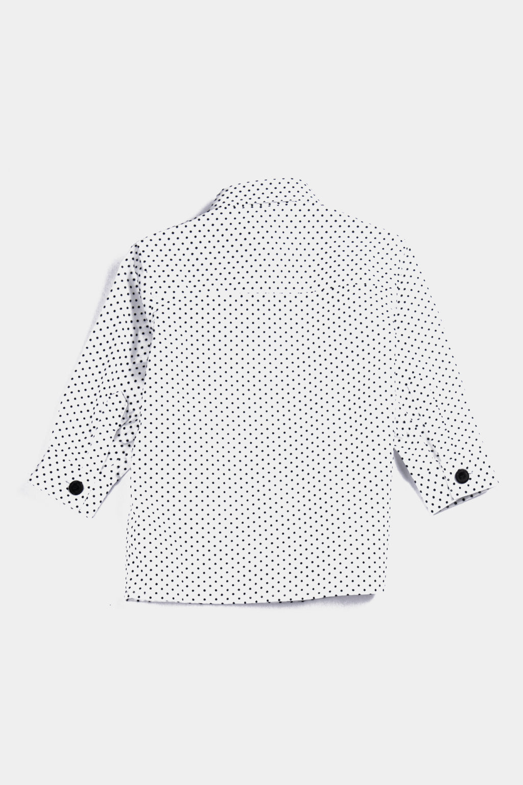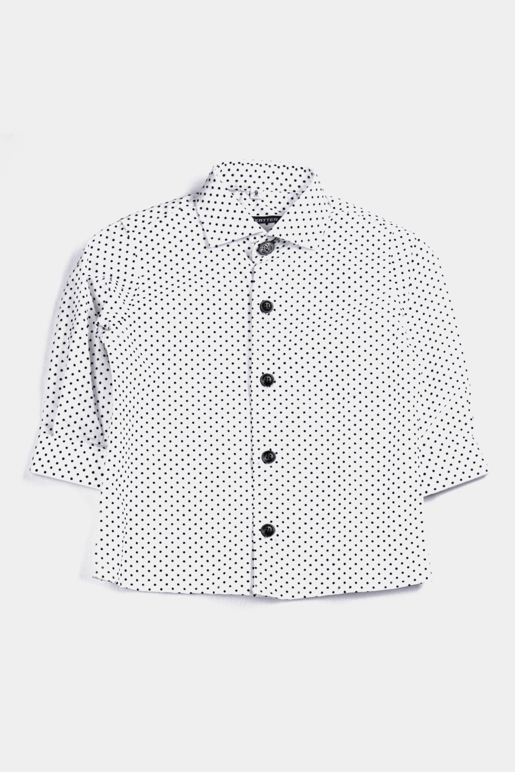 A playful little boy with lots to say, dotted print full sleeve kids shirt by Neill Katter.Product Features - Cotton jersey fabrication.Ribbed trims.Full or paneled shoulders.