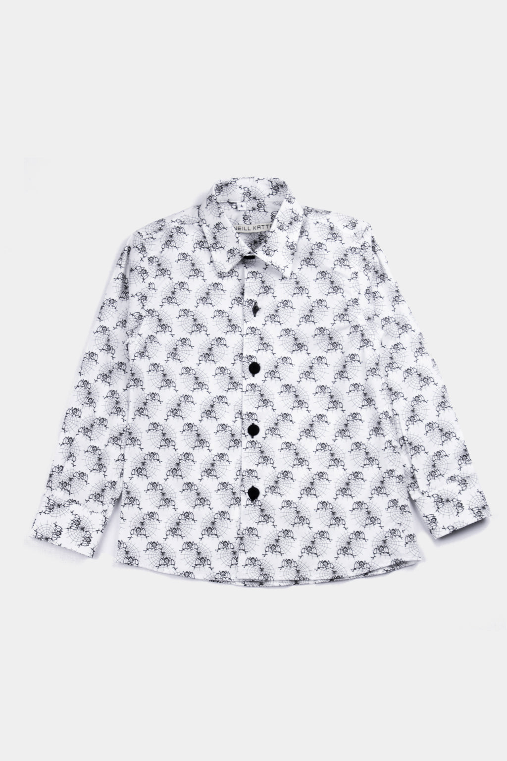A playful little boy with lots to say, dotted print full sleeve kids shirt by Neill Katter.Product Features - Cotton jersey fabrication.Ribbed trims.Full or paneled shoulders.