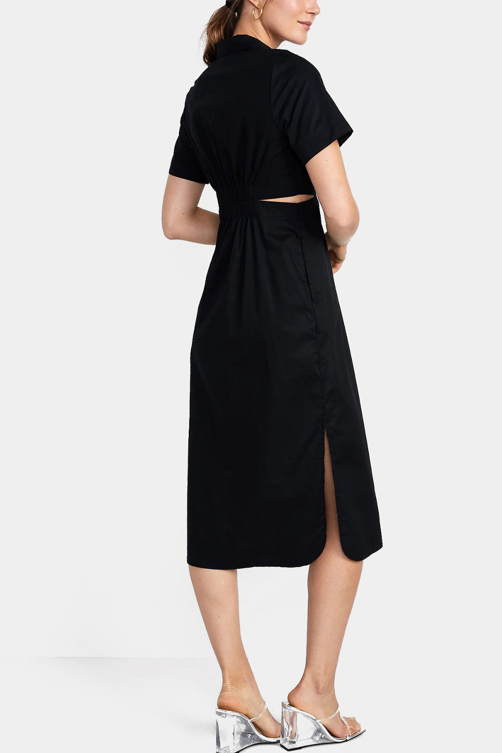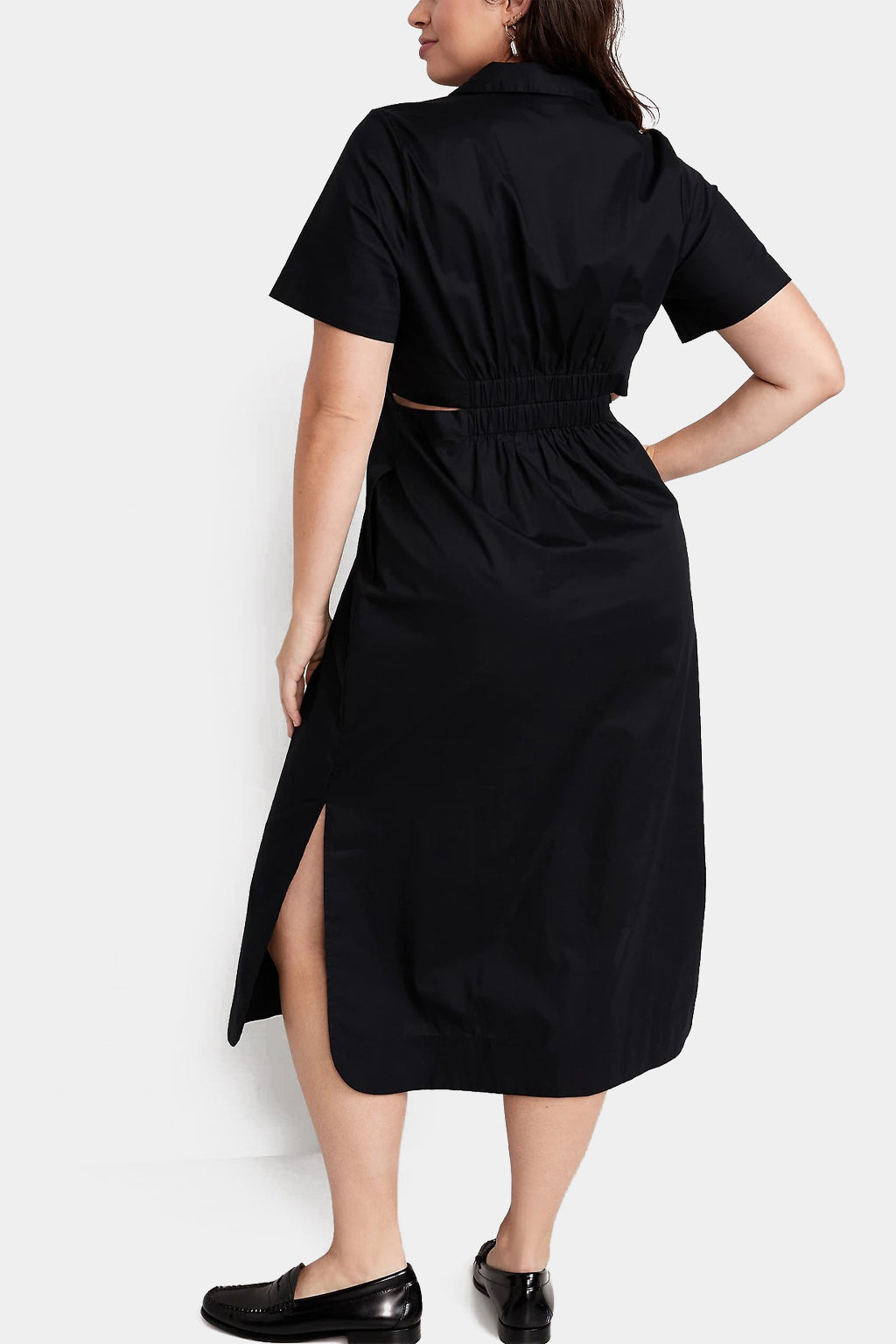 The Old Navy Cutout Midi Shirt Dress for Women is a stylish and versatile dress that can be worn for a variety of occasions. The midi length hits at or below the knee, making it appropriate for both casual and more formal events.