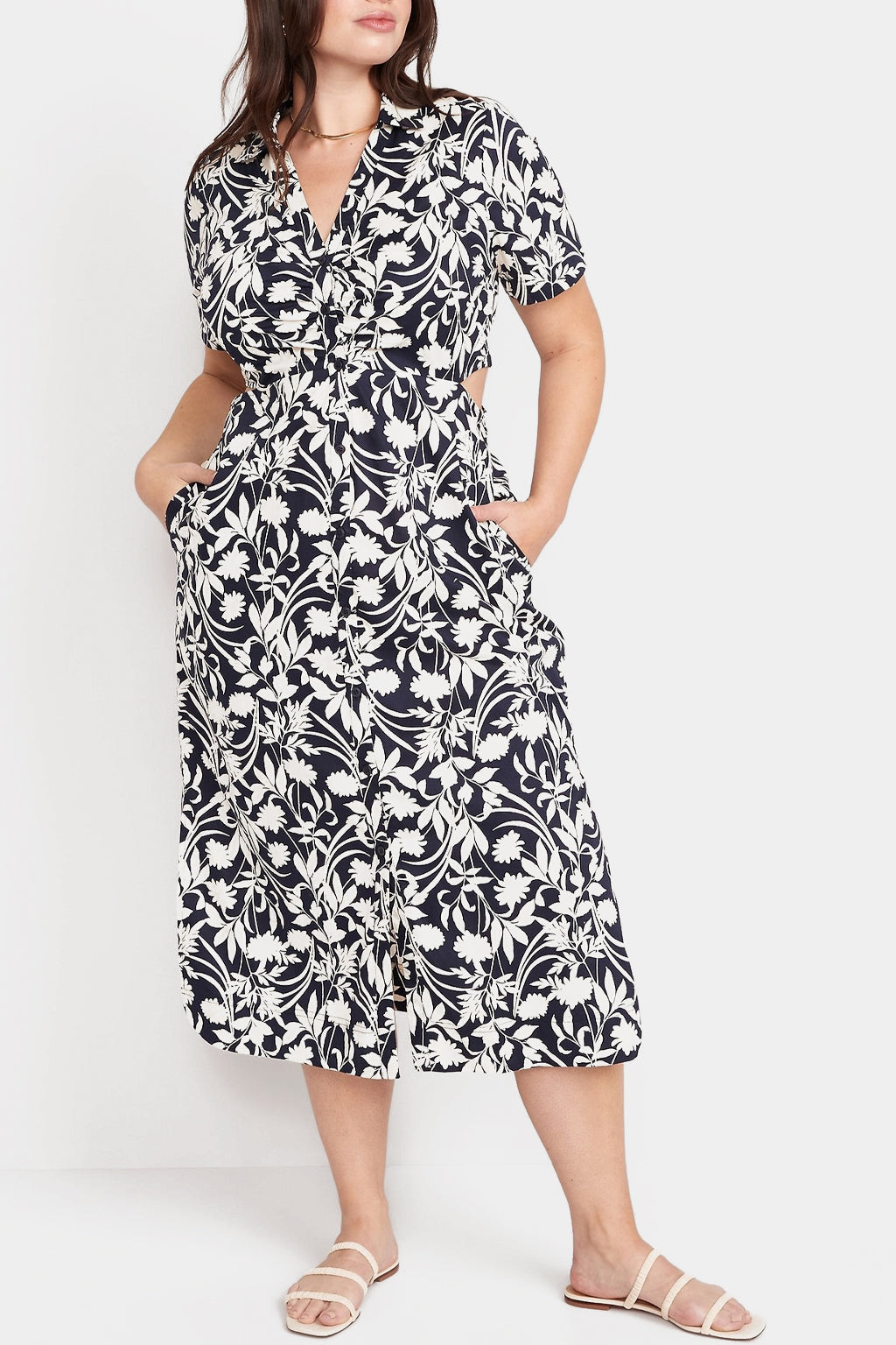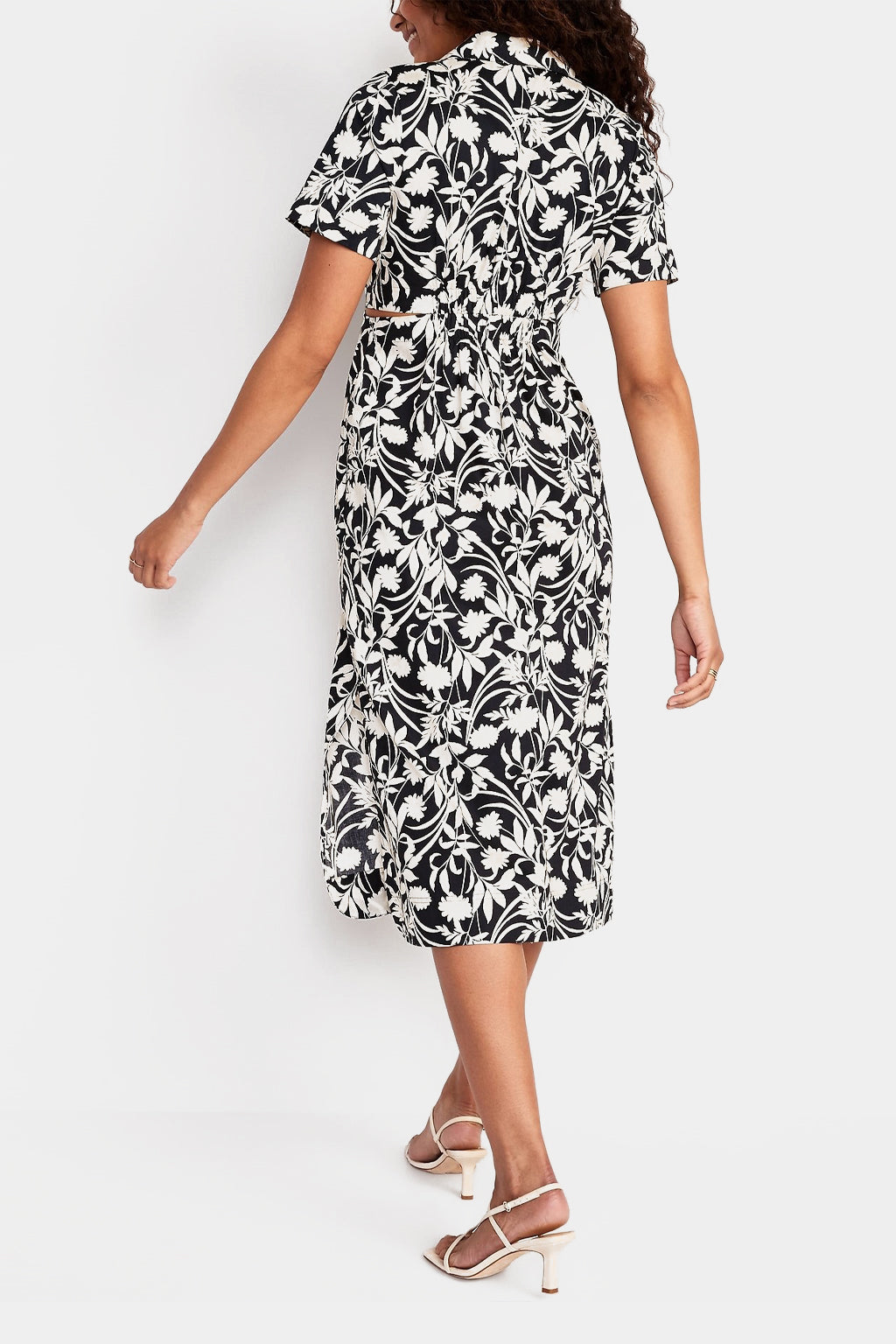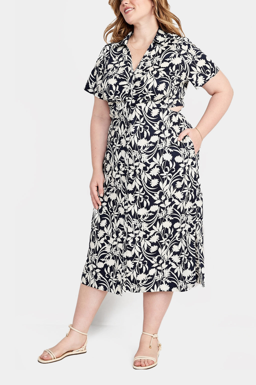 The Old Navy Cutout Midi Shirt Dress for Women is a stylish and versatile dress that can be worn for a variety of occasions. The midi length hits at or below the knee, making it appropriate for both casual and more formal events.