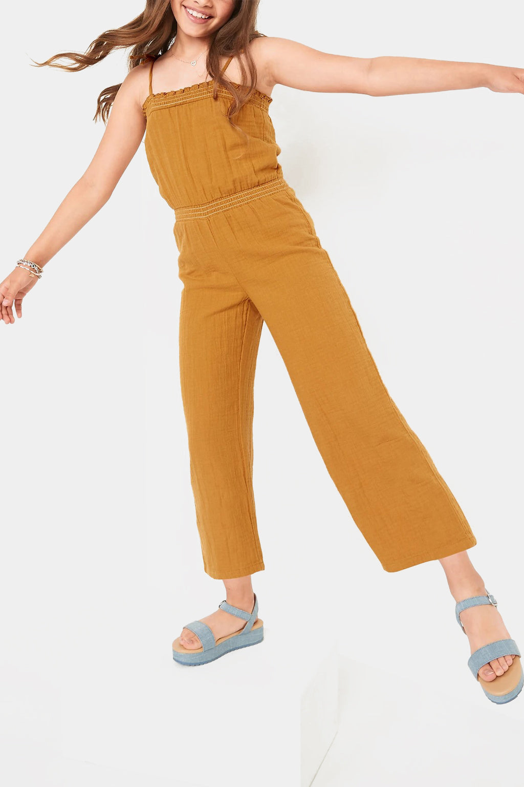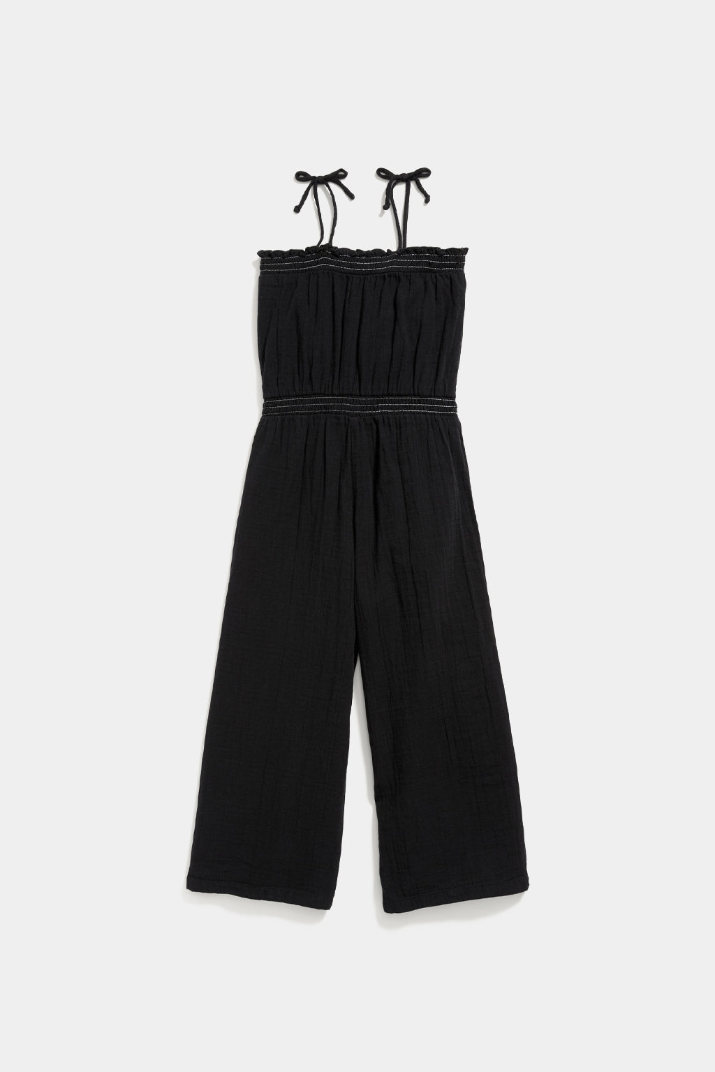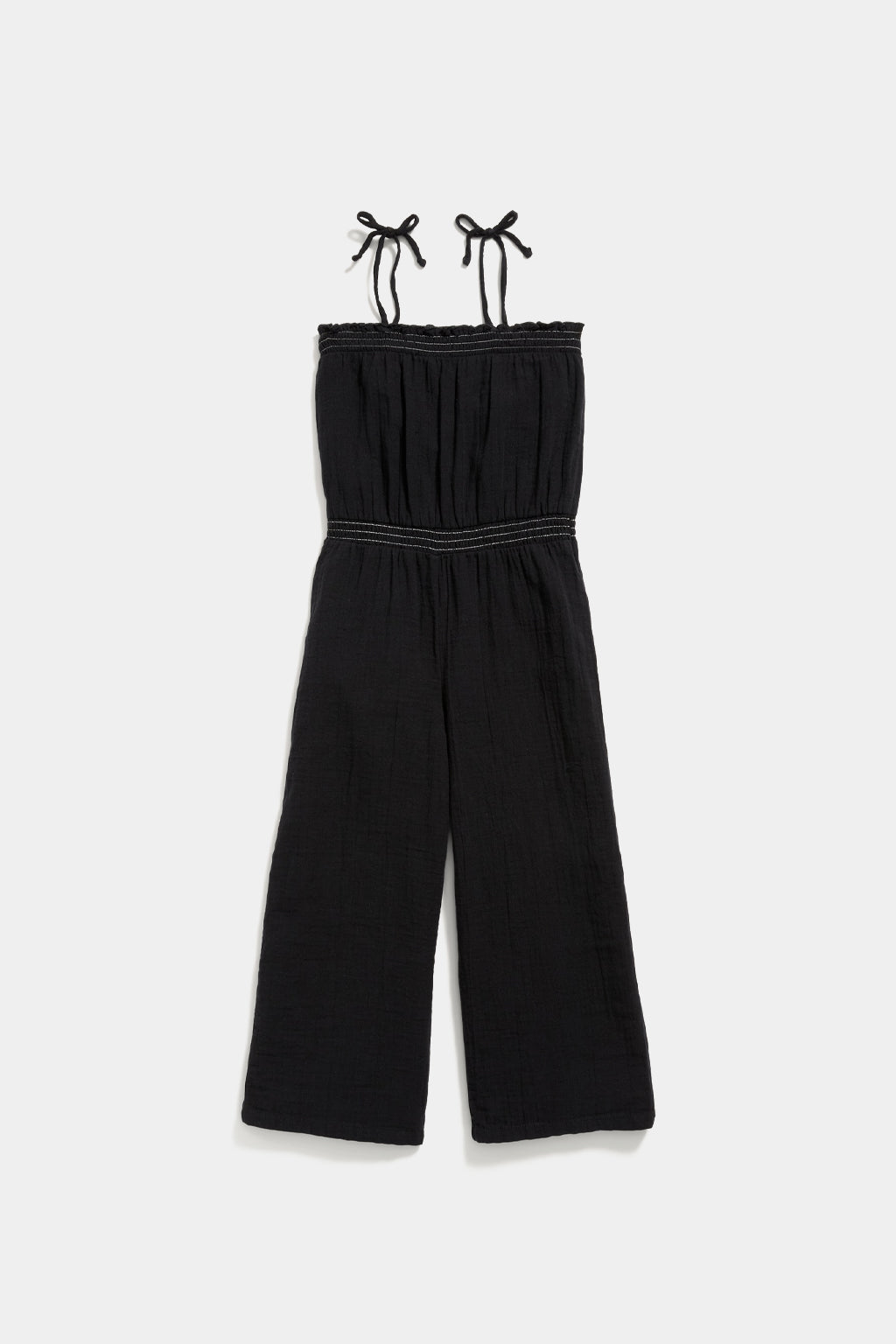 High, ruffled neckline, with smocking detail.Spaghetti straps with decorative bow-tie.Cinched, smocked waist.