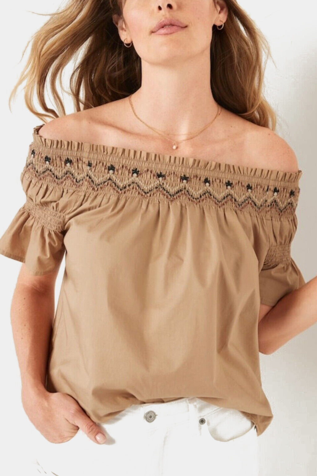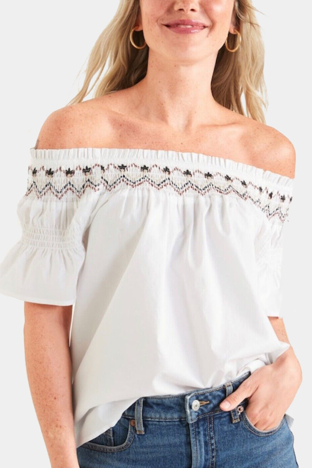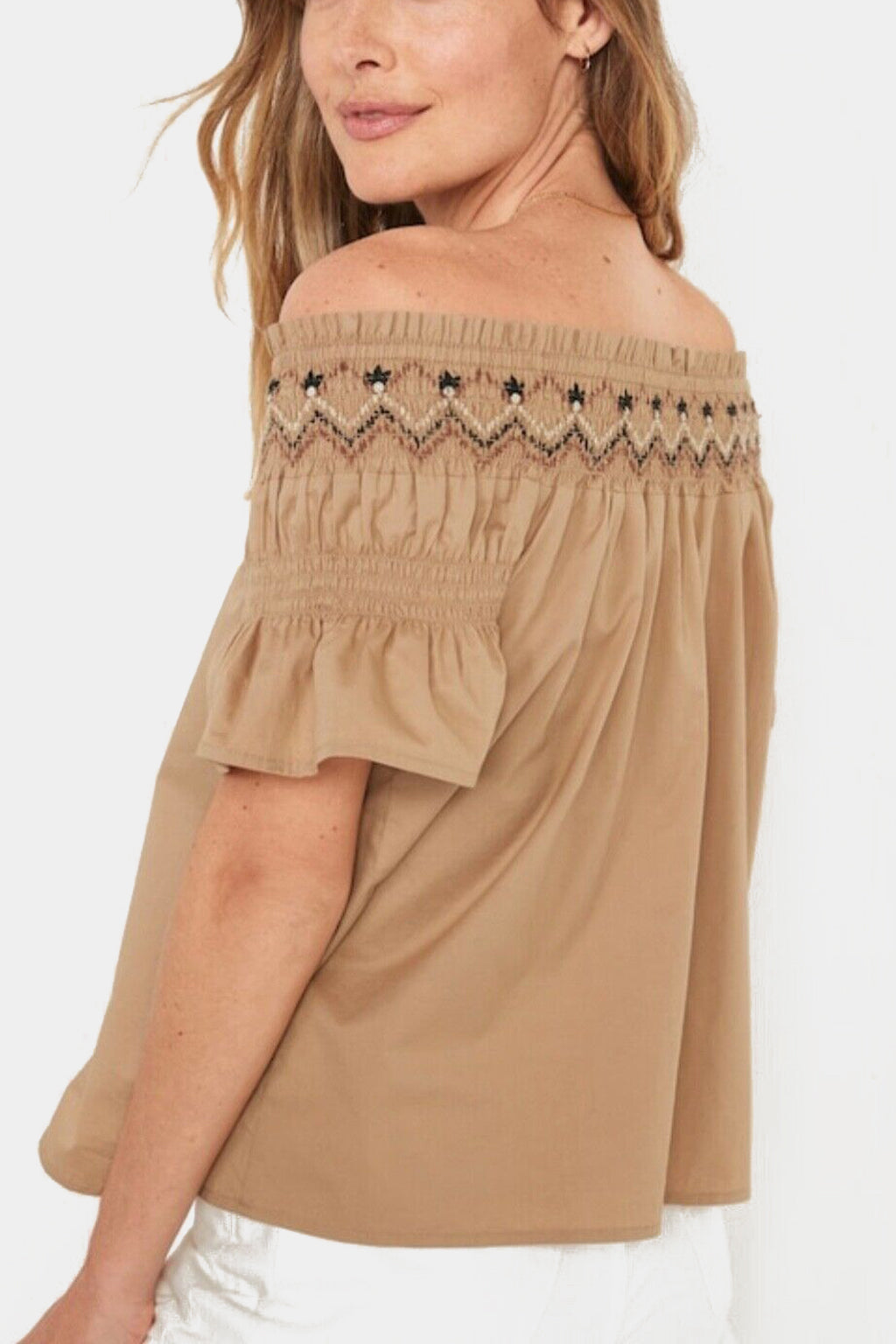 The Old Navy Smocked Off The Shoulder Flutter Sleeve Top is a stylish women's top made from a lightweight, textured woven cotton fabric that's perfect for warm weather. The top features a smocked neckline that sits off the shoulders, creating a flattering and feminine look. The flutter sleeves add a touch of whimsy and movement, making this top perfect for both casual and dressy occasions.
