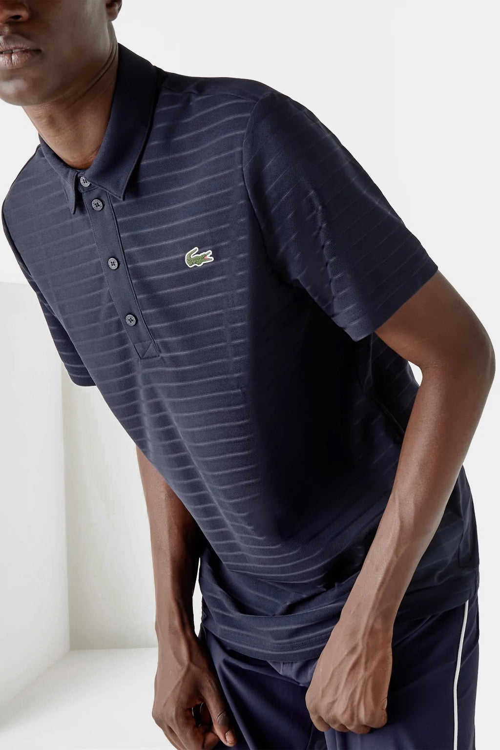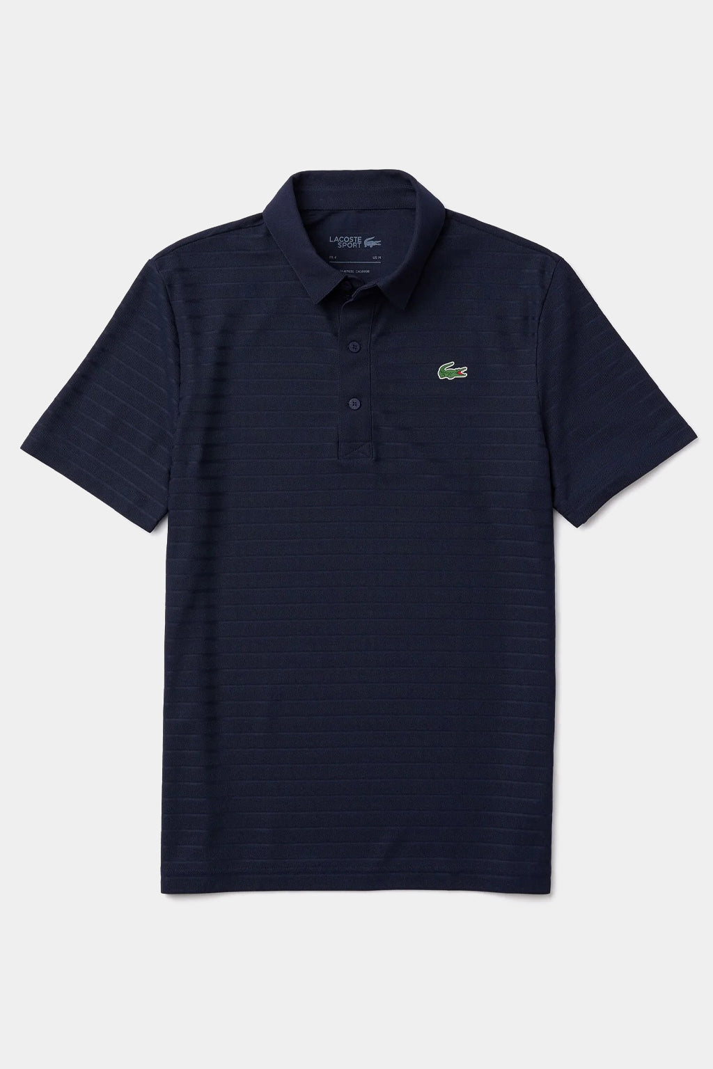 An elegant golf polo shirt that features a four-button collar. This iconic piece is crafted from an ultra-dry striped jacquard jersey with the iconic brand crocodile on the chest for accent and comfort. Breathable ultra-dry stretch jacquard jersey. Four-button shirt style polo collar. Green crocodile transfer on chest.