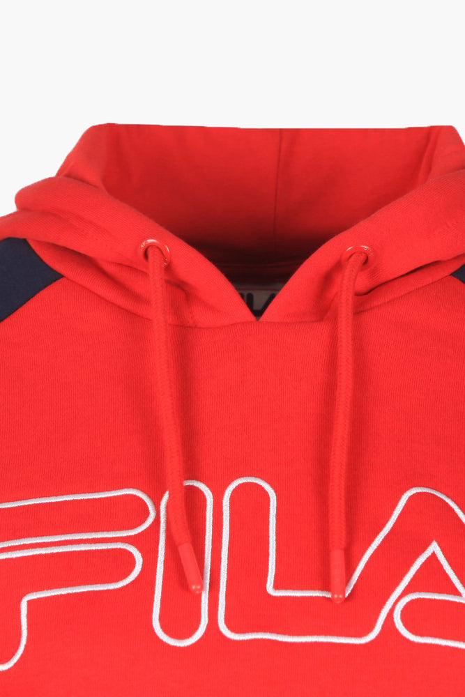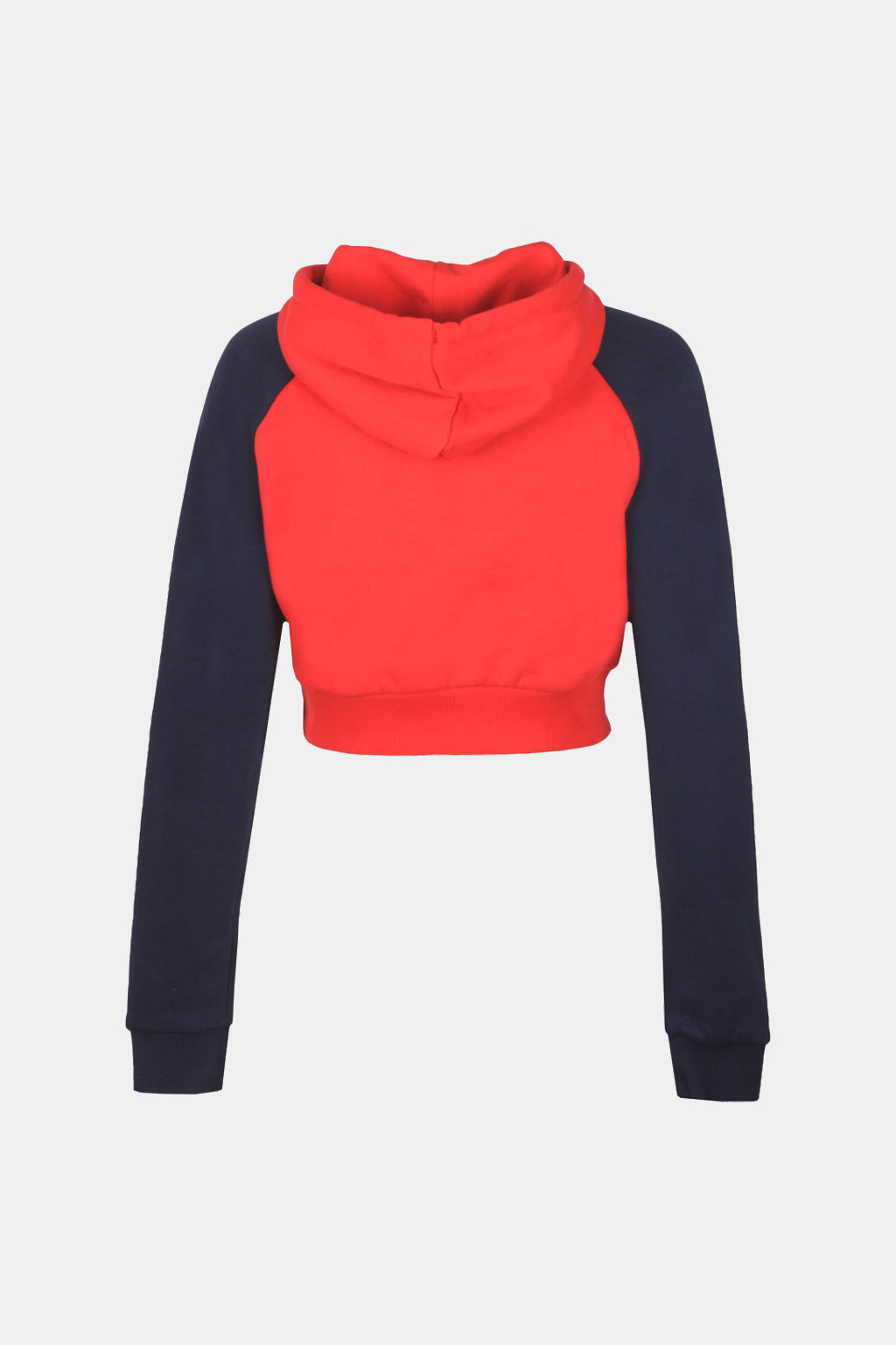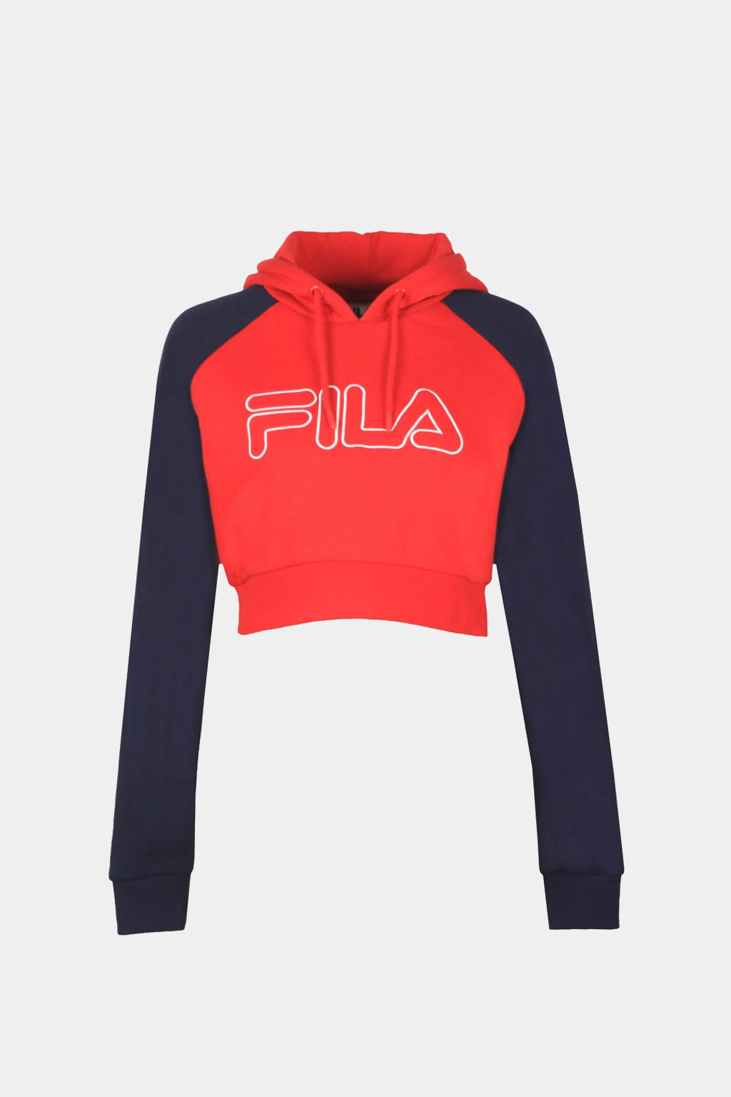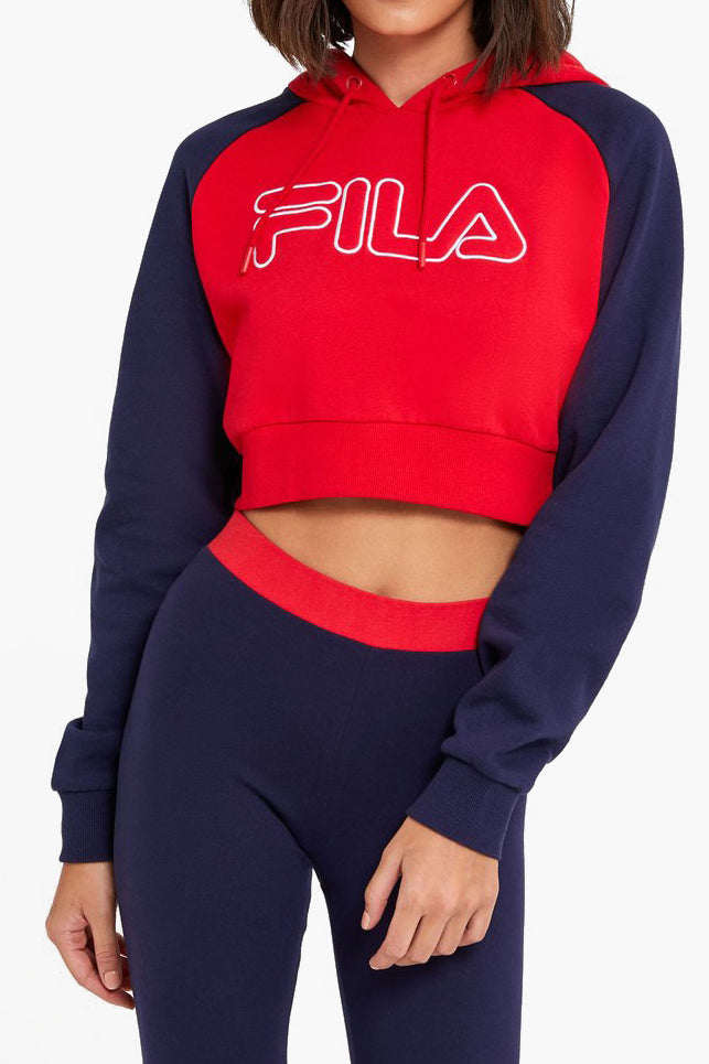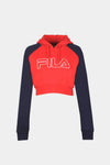 Stand out in this trendy Valeria color block raglan hoodie featuring a cropped waist and eye-catching two-tone design with our fila logo embroidered across the front.