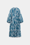 Midi dress featuring a slot collar, long sleeves with elastic cuffs and a panelled hem.